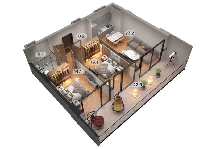კომპლექსში კომფორტული საცხოვრებელი სახლების გარდა გათვალისწინებულია: ევროპული სტანდარტების ფიტნეს დარბაზი და ღია აუზი, ლობი და კონსიერჟის მომსახურება, კაფეები, სუპერმარკეტი, აფთიაქი და სხვადასხვა სავაჭრო ობიექტი.