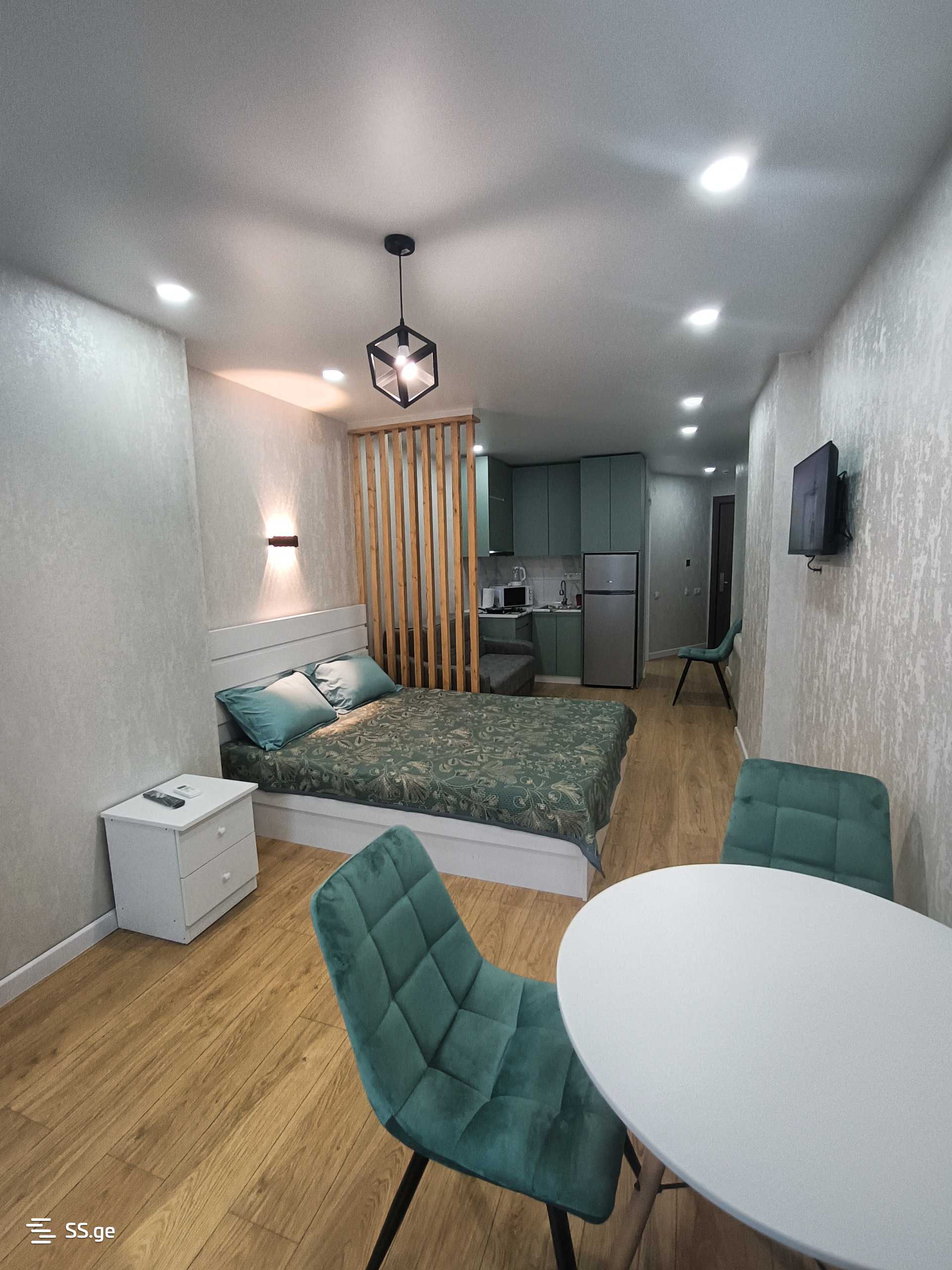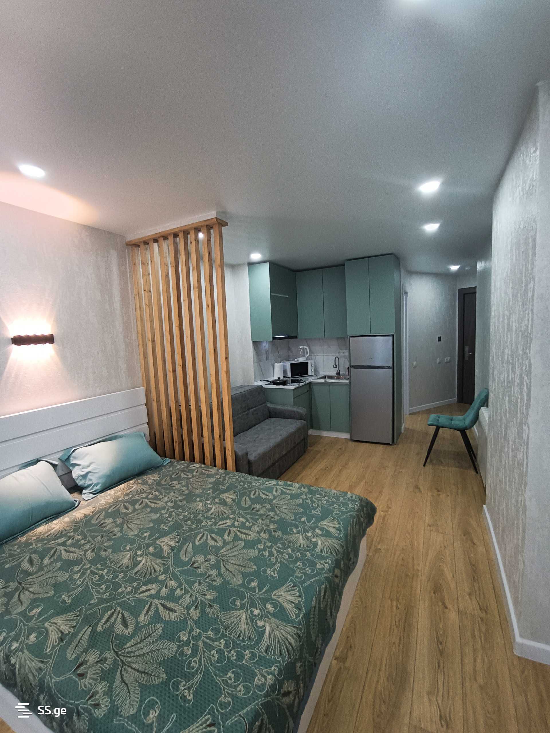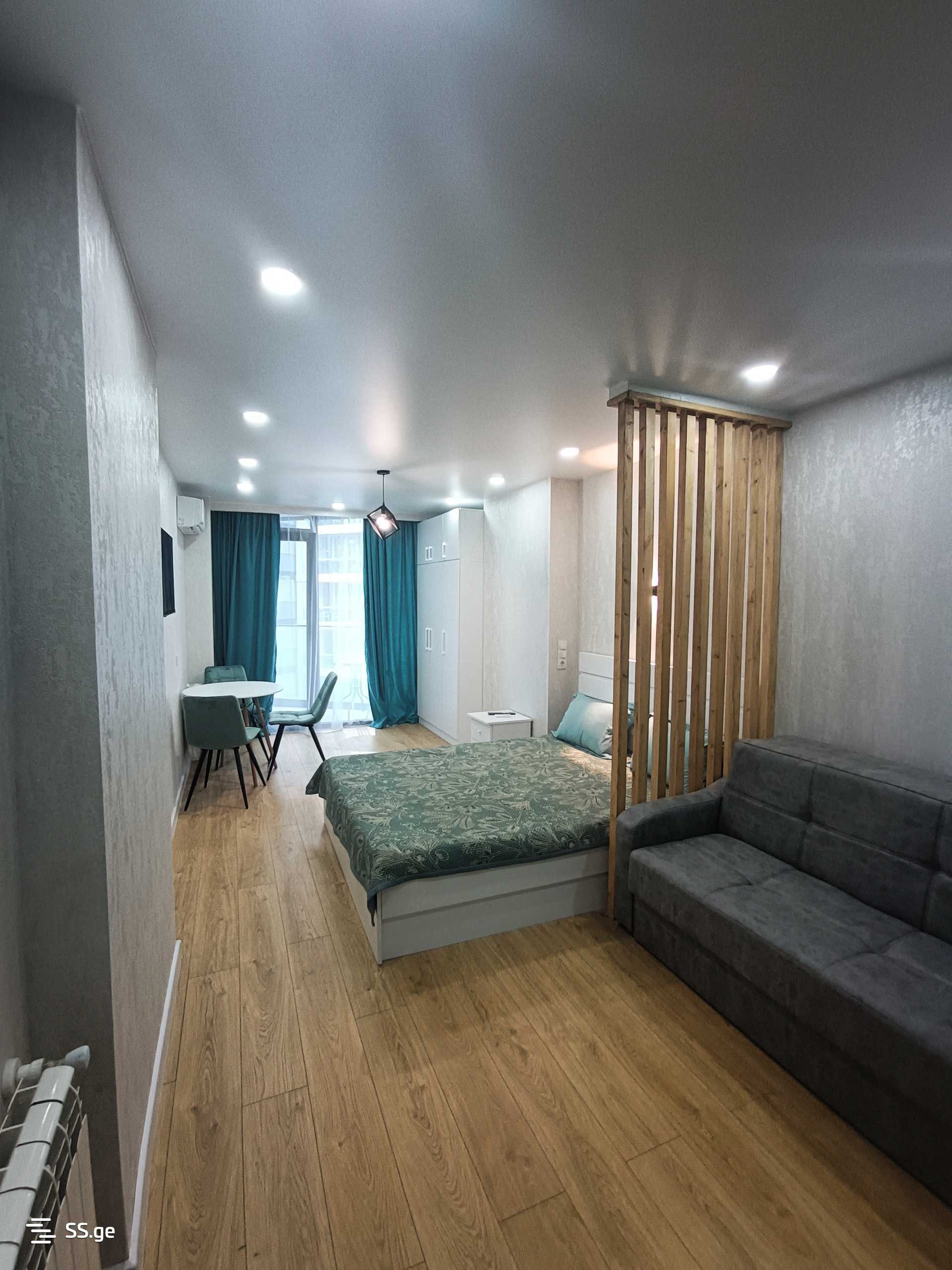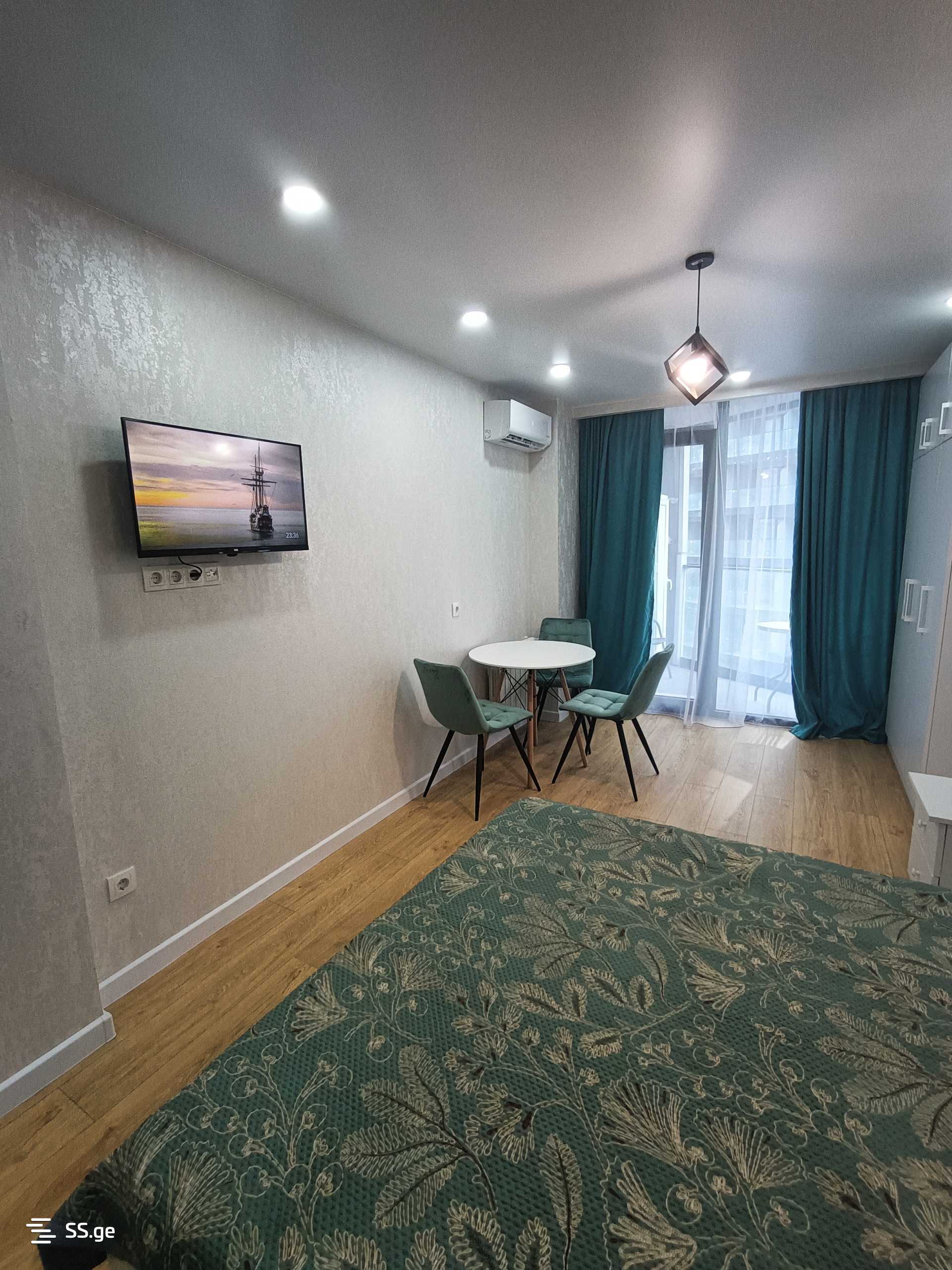 Comfortable studio for rent in the Sunset complex. This apartment is being rented for the first time, previously it was not rented. Located at Nizharadze 20, ELT Quarter. Central heating, excellent location: a new district with developed infrastructure, the sea and navigation are only a 2-minute walk away. New complex with administration and fast elevators. Newly renovated, modern furniture and appliances. Spacious 40 m²: large shower, sofa bed, double bed, air conditioner, refrigerator, tumble dryer, microwave oven, TV. 8th floor with side sea view. $400