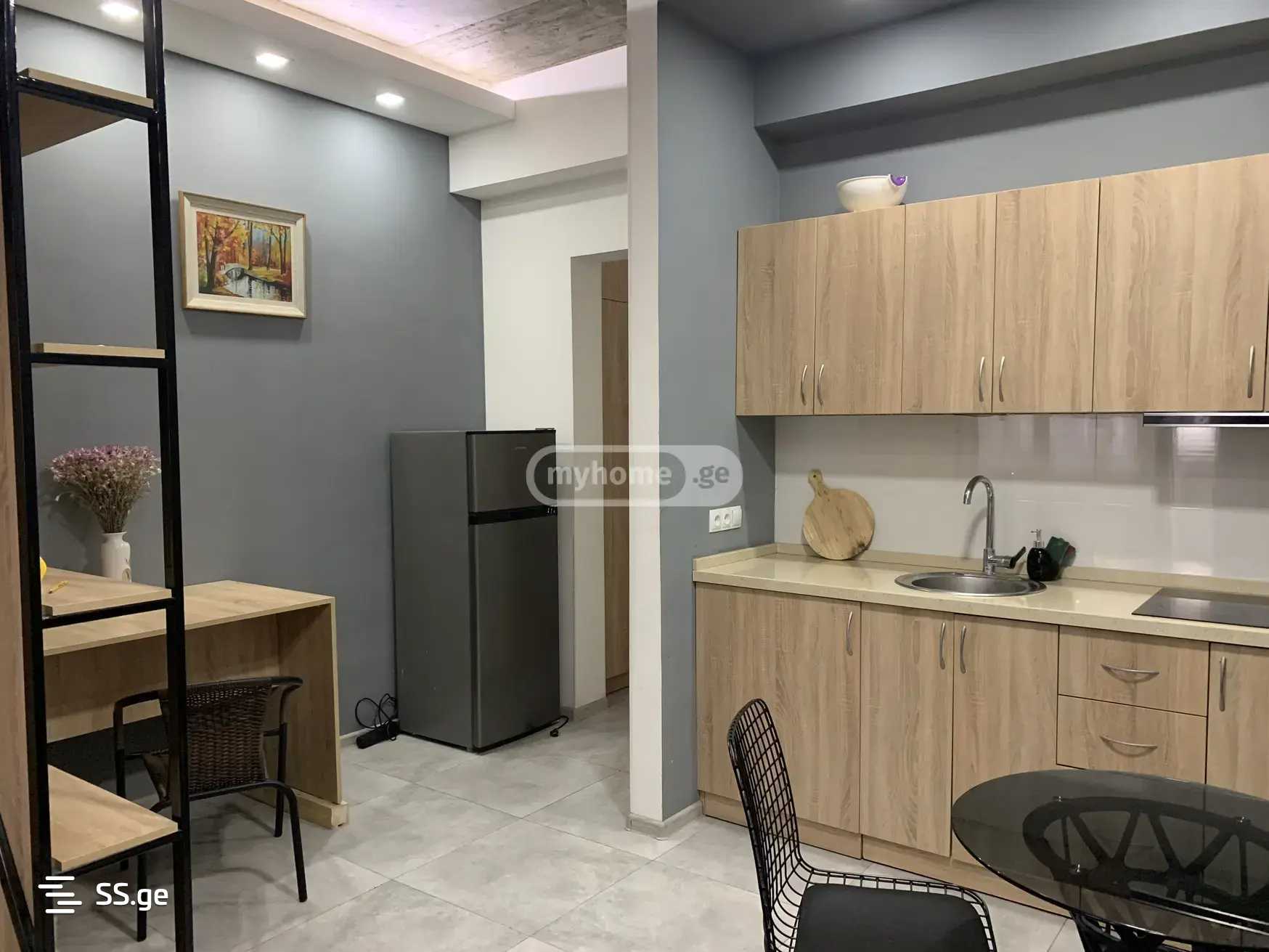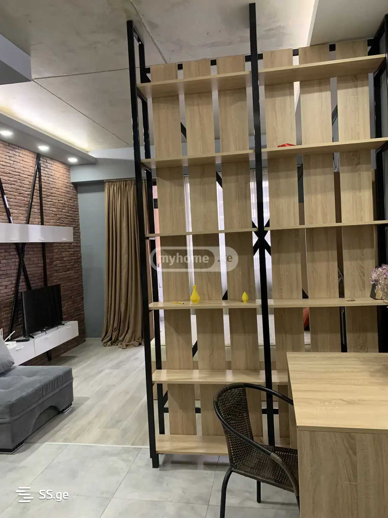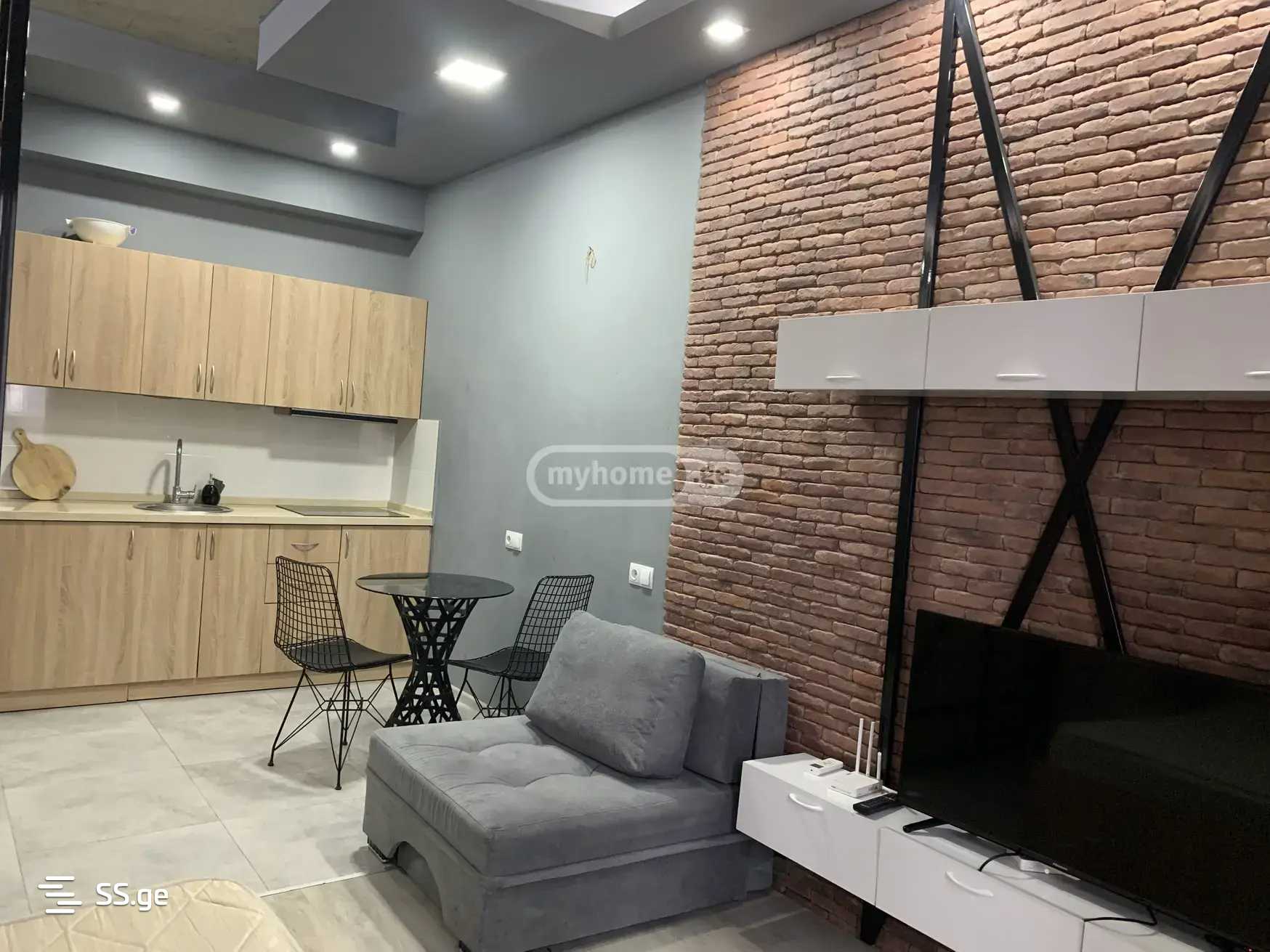 A newly renovated, 39 square meter studio-type apartment is for rent in a new house, equipped with a kitchen, refrigerator, bathroom, air conditioning, central heating, internet, television, and a view of Tbilisi. The house is close to the metro (1 minute walk) near the Sports Palace.