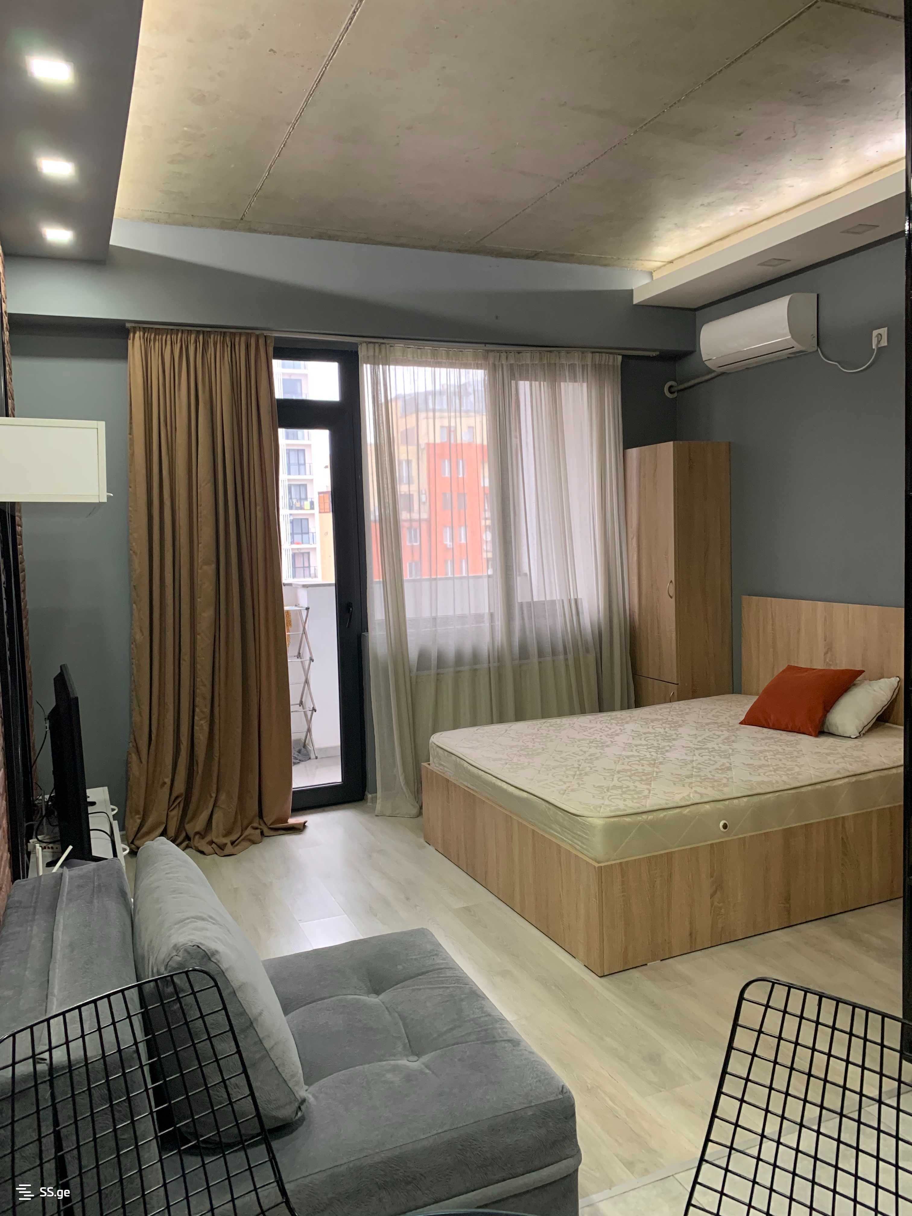 I am renting a studio-type apartment, 39 sq.m in Tbilisi, Berbuki Street, near Sports Palace. Newly renovated, with central heating, air conditioning, furnished, with a built-in kitchen, refrigerator, washing machine, TV, and optical internet. It has a balcony.