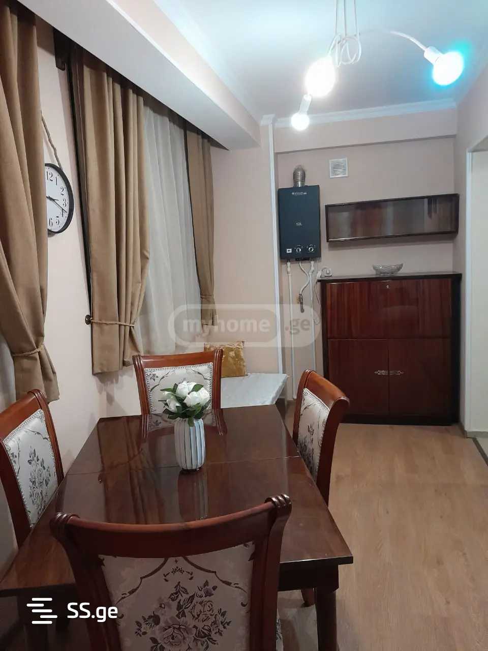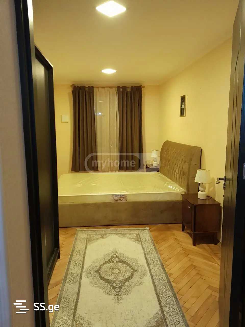 For rent for 6 months, near the Metro Sameditsinos, next to the Aversi Clinic in Saburtalo, a two-room apartment with a loggia, separate kitchen, living room, and bedroom. With appliances and furniture.
