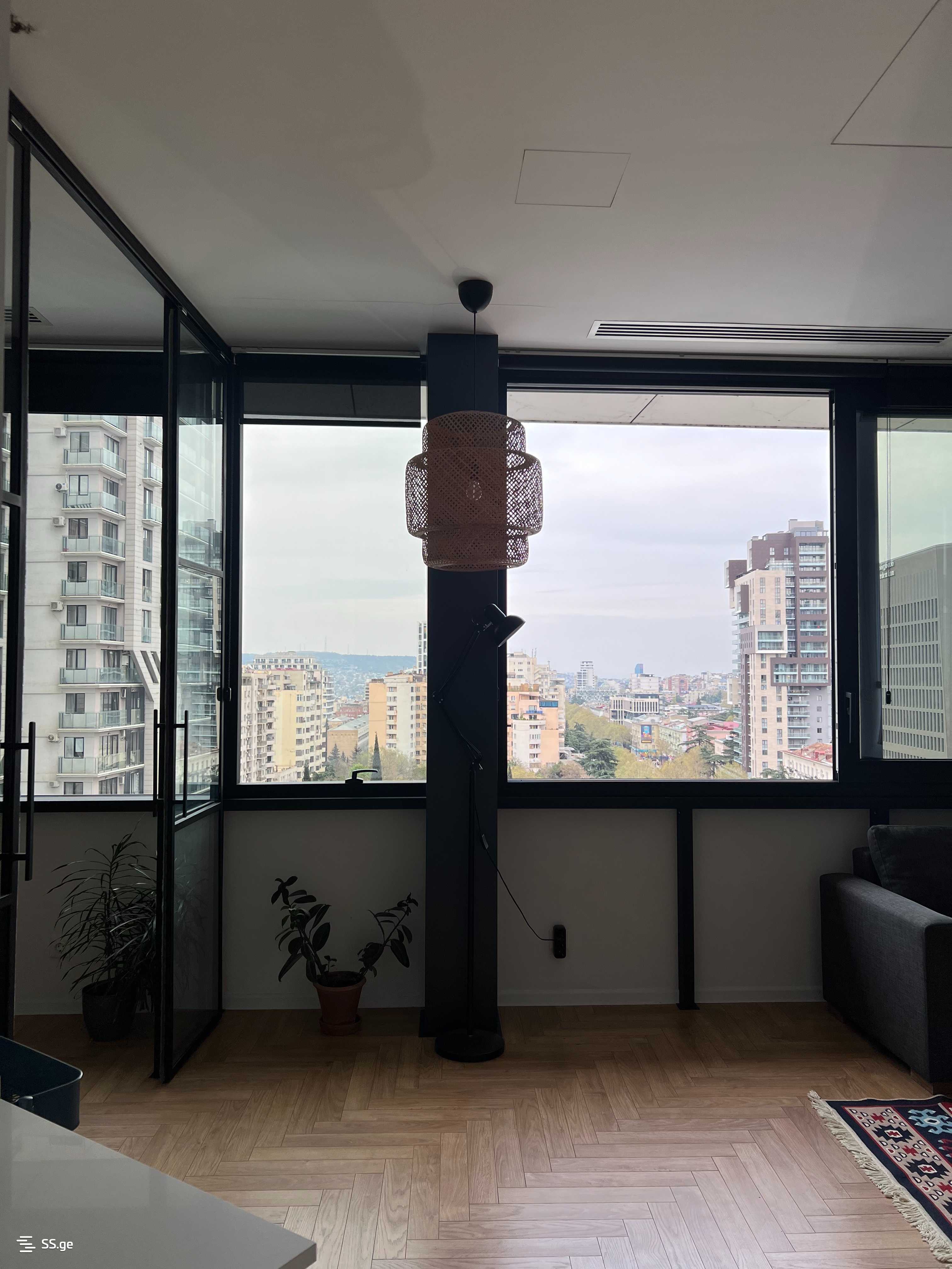 The apartment offers an impressive view of the city; one of the panoramic windows slides for convenient ventilation.