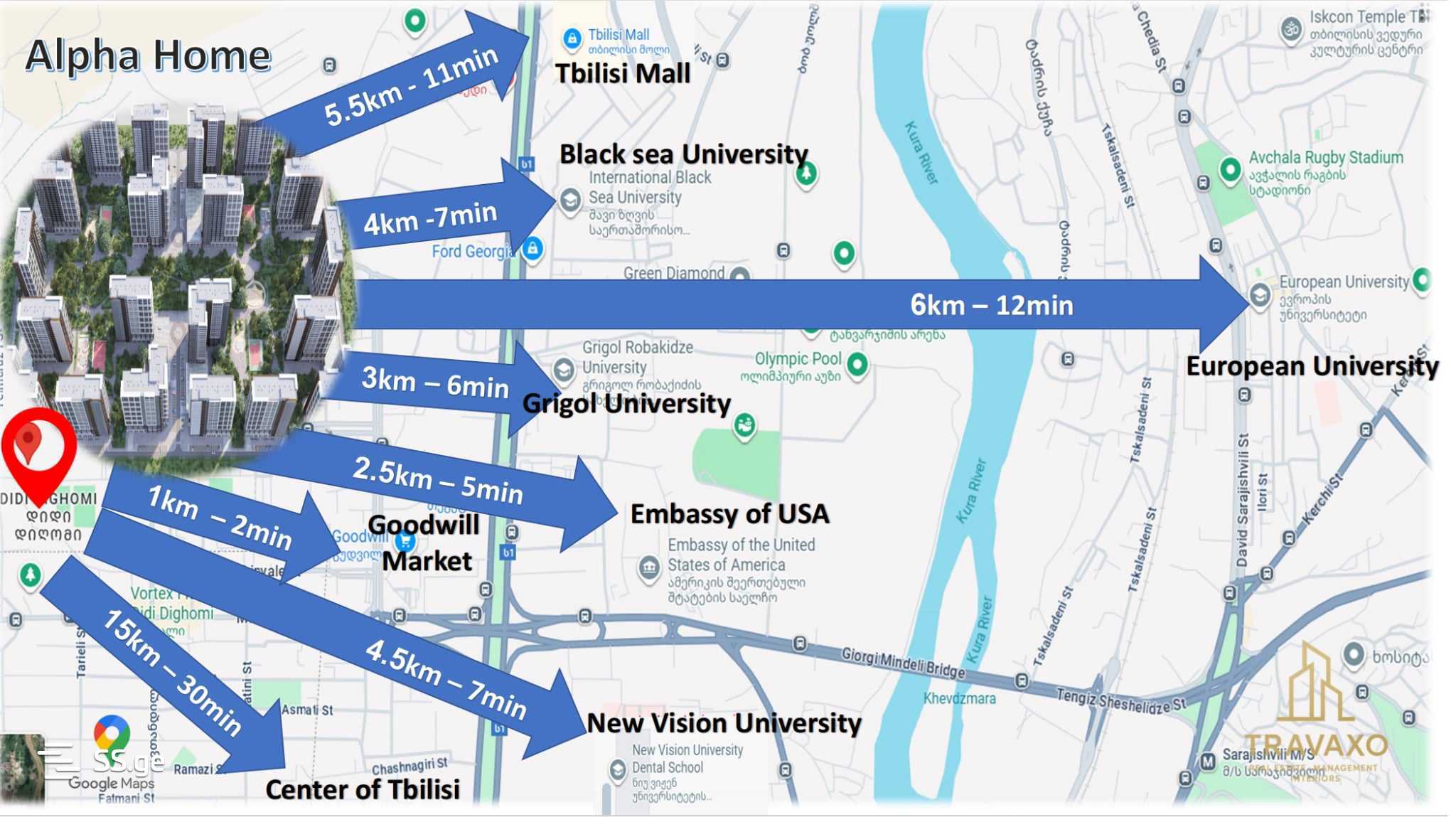 * Apartments for sale in Digomi, in the construction complex Alpha Home (the complex is being built by TRAVAXO GLOBAL). There are both completed buildings and still under construction. The complex is located on Petre Iberi Street and is close to all necessary establishments, including Goodwill Market, Tbilisi Mall, Black Sea University, Agricultural and Free Universities, and also Grigol Robakidze University.