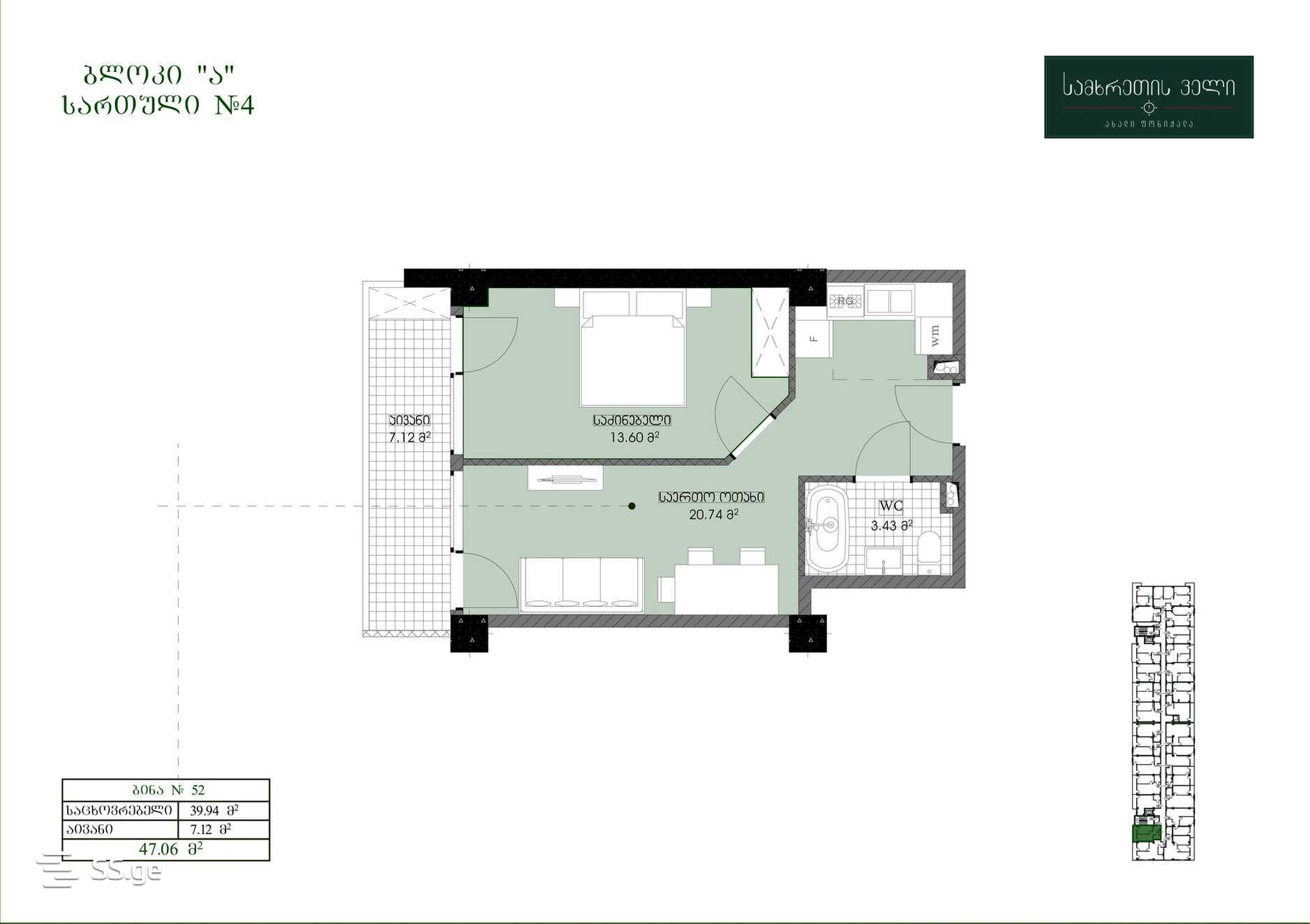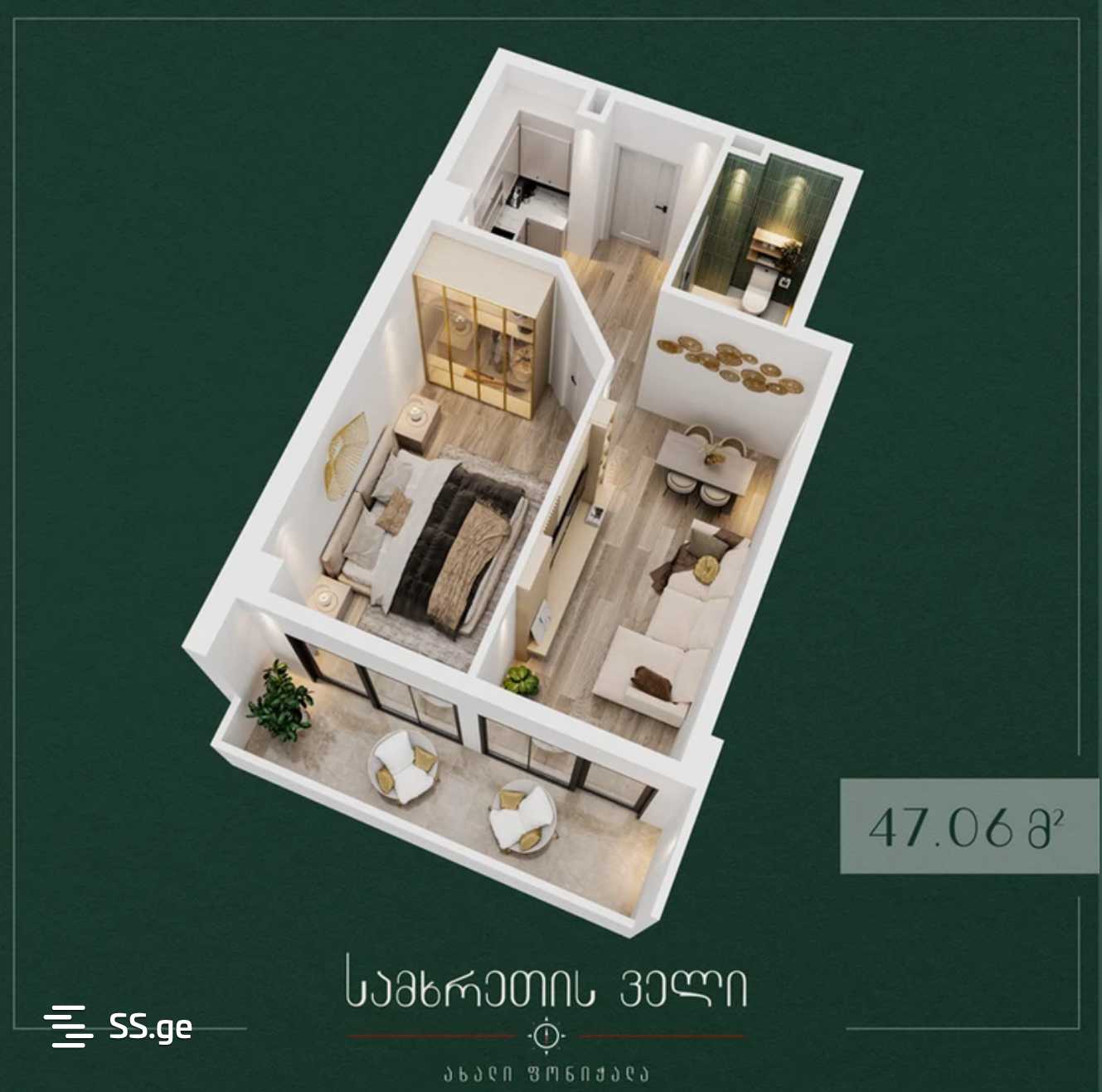 New Ponichala, Spiridon Virsaladze Street N5. Payment can be made by installments or internal installments. Apartments of various sizes are available. Samkheti Veli is the first premium class complex in New Ponichala. 10,000 sq.m. Three residential blocks built on a protected territory create an exclusive concept closed area, the main idea of which is to take care of your daily comfort. Sports and activity zone, children's zone, pool zone, relaxation and recreation zone, barbecue zone. You have access to all the necessary facilities for daily comfort without leaving the territory: pharmacy, bank, shop, fitness center, office and commercial spaces, modern standard parking lots.