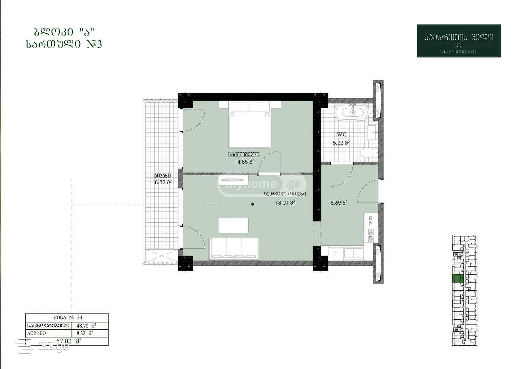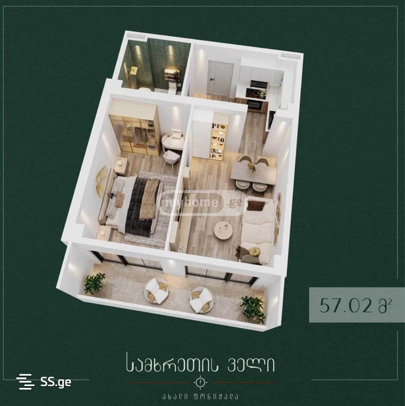 New Ponichala, Spiridon Virsaladze Street N5. Payment can be made by installments or internal installments. Apartments of various sizes are available. Samkheti Veli is the first premium class complex in New Ponichala. 10,000 sq.m. Three residential blocks built on a protected territory create an exclusive concept closed area, the main idea of which is to take care of your daily comfort. Sports and activity zone, children's zone, pool zone, relaxation and recreation zone, barbecue zone. You have access to all the necessary facilities for daily comfort without leaving the territory: pharmacy, bank, shop, fitness center, office and commercial spaces, modern standard parking lots.