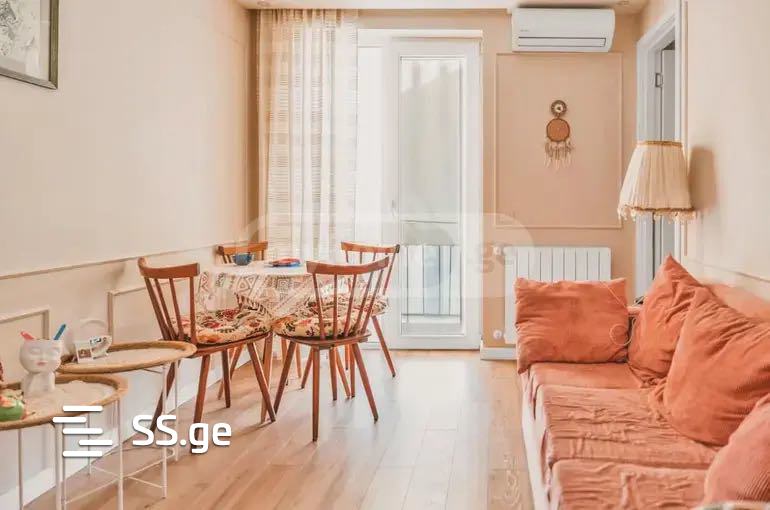 For sale, corner apartment on Viktor Dolidze Street – ideal location and comfort in one space! For sale, a bright and fully renovated 2-room corner apartment (with an isolated kitchen) in one of the city's most practical and cozy locations, on Viktor Dolidze Street. Storage and furniture: the apartment includes a refrigerator, built-in kitchen, dishwasher, washing machine, built-in bedroom furniture (bed, wardrobes, makeup table); Entrance: renovated and secured with a chip system and camera; Parking: there is a parking space in the yard with a barrier. <3