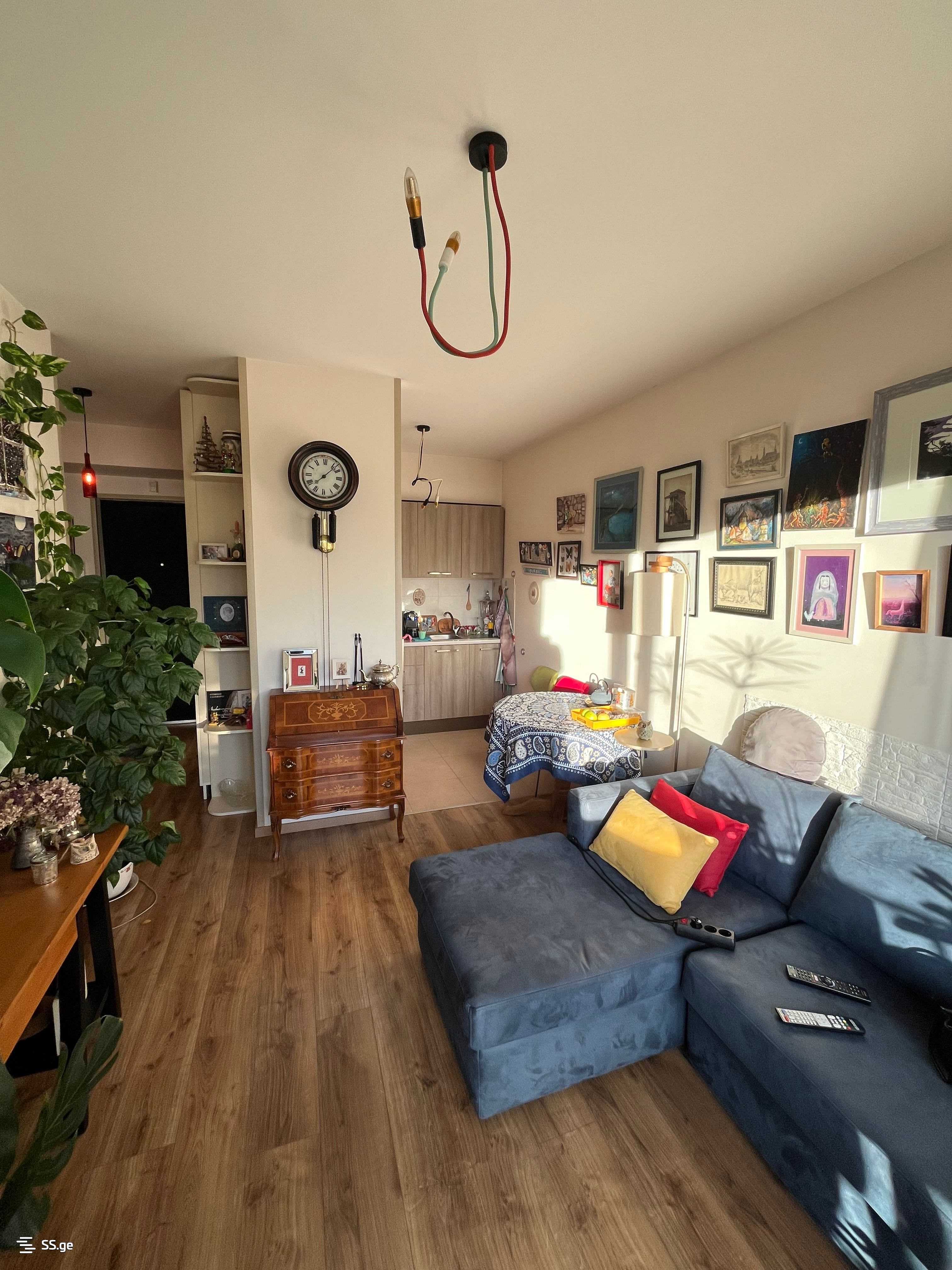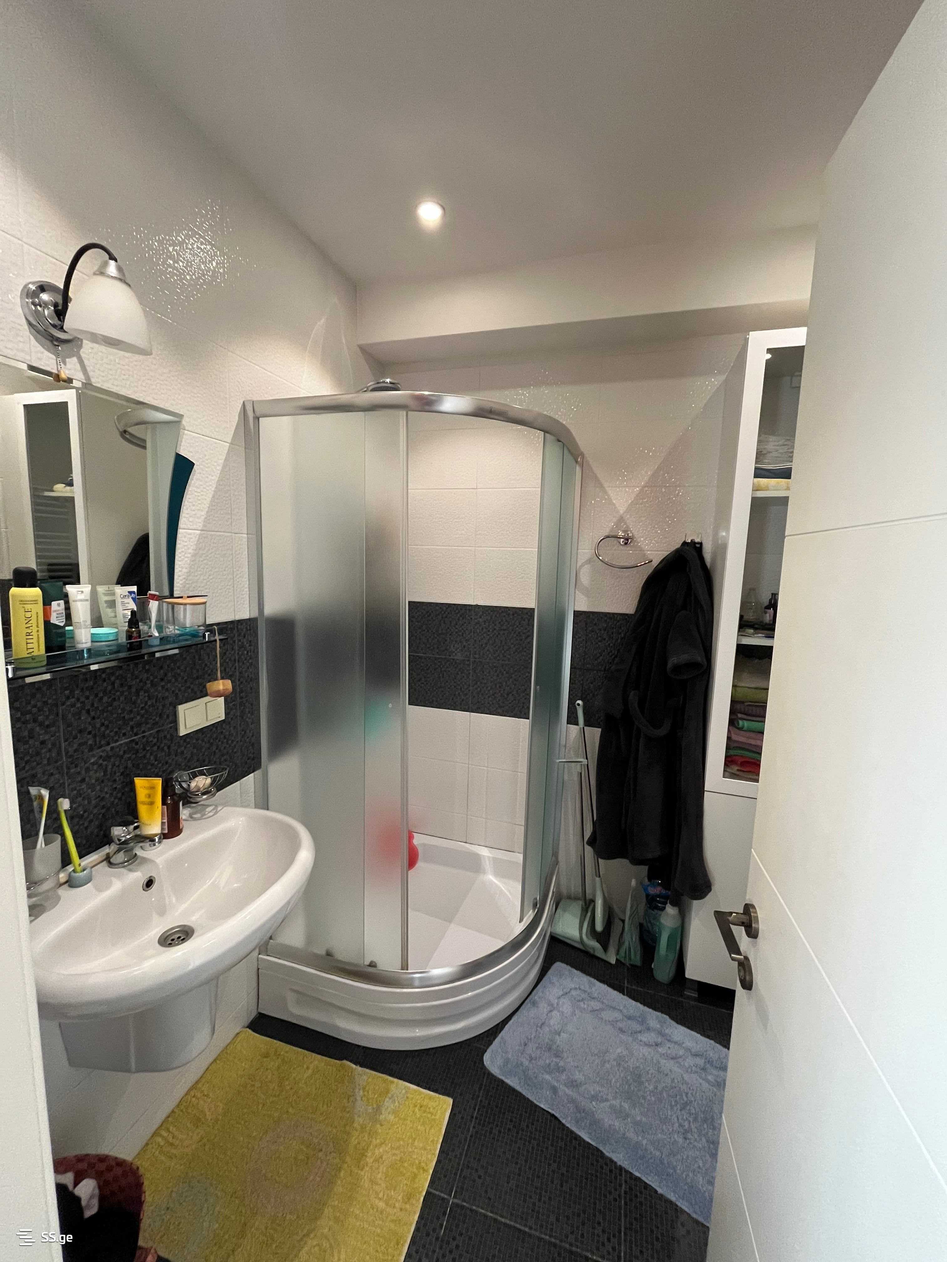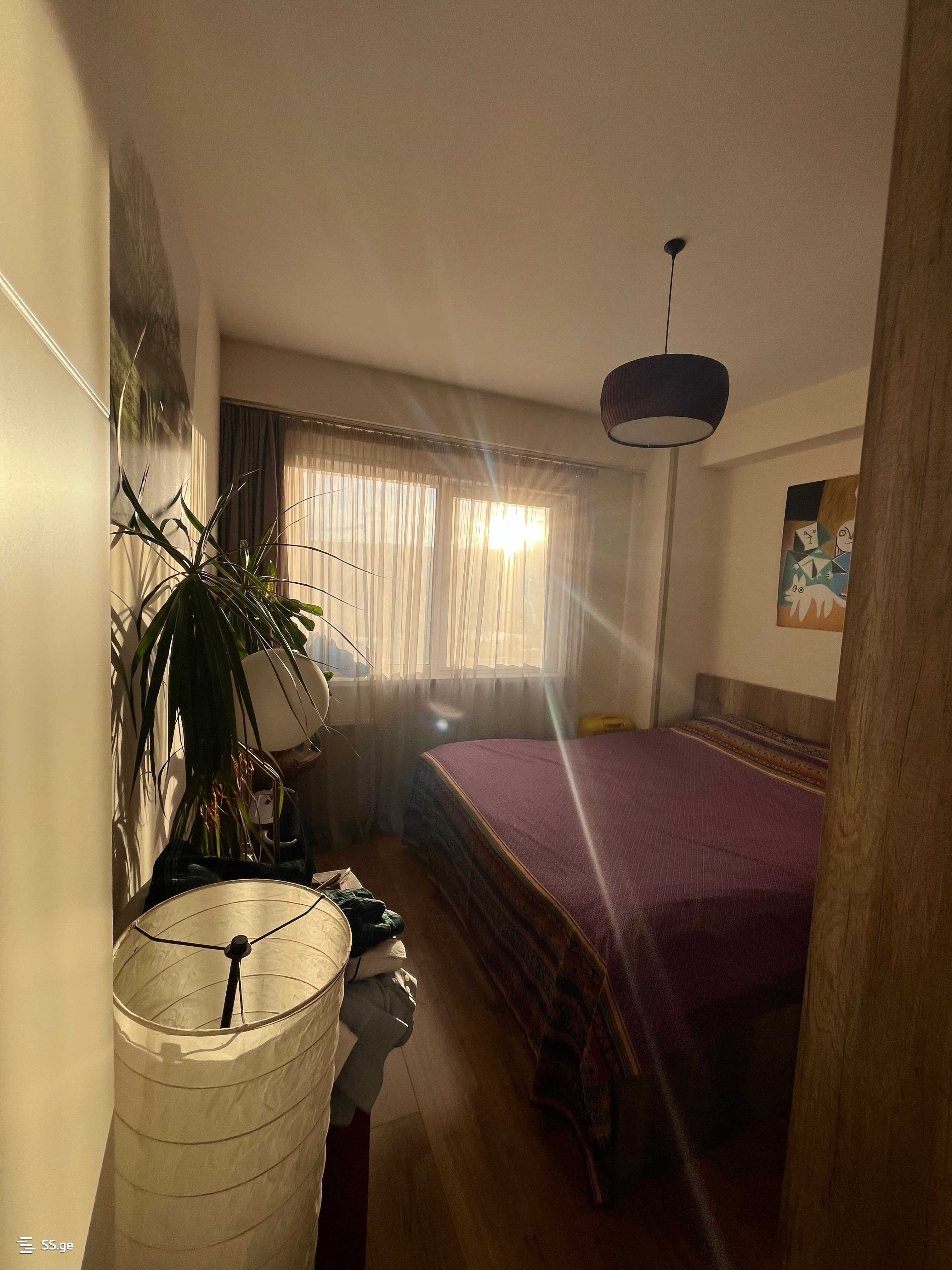 A bright 2-room apartment is for sale in the 'Optima Isani' complex on the 11th floor. The apartment comes with a fully equipped kitchen with a stove, a built-in wardrobe for books and shoes, air conditioning, central heating, a king-size bed with storage, and a large wardrobe with a mirror. (In case of negotiation, a sofa and a washing machine are included).
