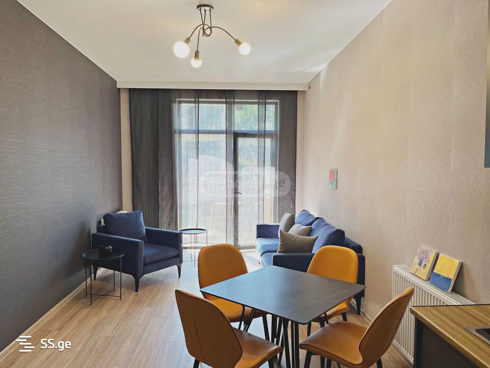 The apartment has a studio-type living room, kitchen, bedroom, bathroom, and balcony. It is fully furnished with furniture, large household appliances (including a dishwasher and air conditioner).