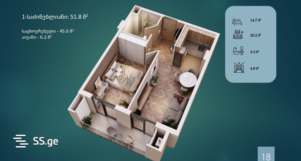 The main advantage of the project is its convenient location, both for living and for investment: 5 minutes from Freedom. 10 minutes' walk from "300 Aragveli" metro station. Proximity to various city transport. Project data Area: 2190 sq.m. The 12-story building complex includes 76 apartments, there are 6 penthouses on the 12th floor, a 3-level parking lot with panoramic views, for 61 cars, equipped with a car elevator. 2-4 floors - office space with independent entrance and individual elevator.