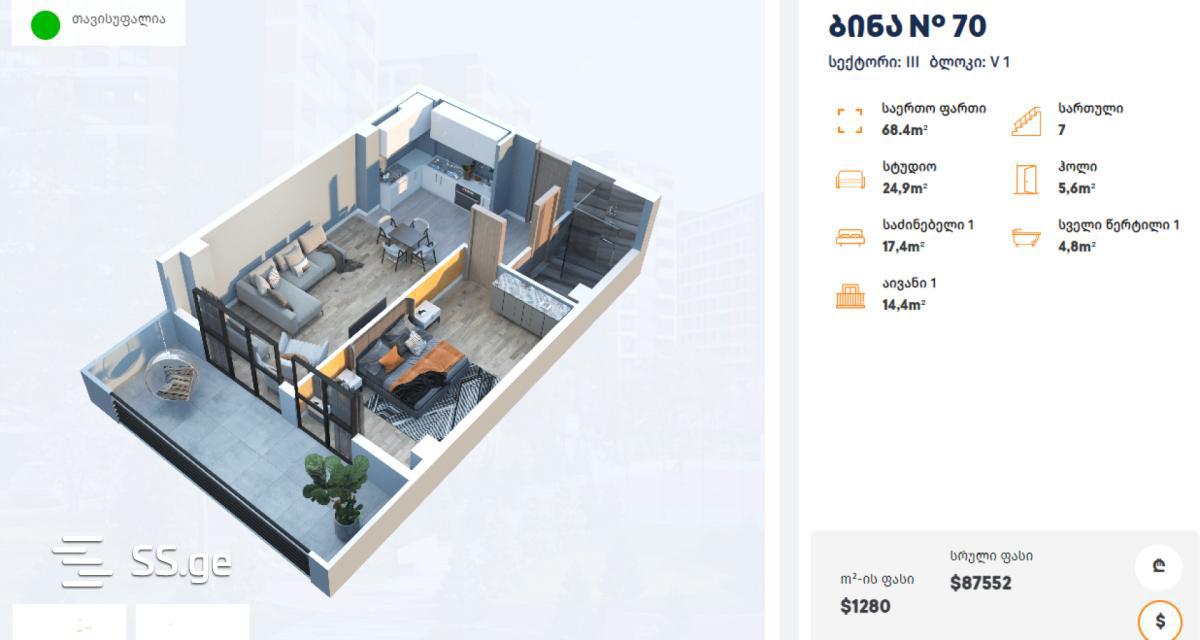 შეიძინეთ ბინა სააქციო ფასად. 87 552$ის ნაცვლად 80 712$ად.პროექტი სრულდება 2024 წლის ბოლოს. ბინა ბარდება თეთრი კარკასის მდგომარეობაში. პროექტის ფარგლებში აშენდება აუზი კორპუსებს შორის, რომელიც იქნება საერთო მოხმარების, შიდა ტერიტორიაზე გადაადგილება შესაძლებელი იქნება მხოლოდ ფეხით.შესაძლებელია შიდა განვადებაც.