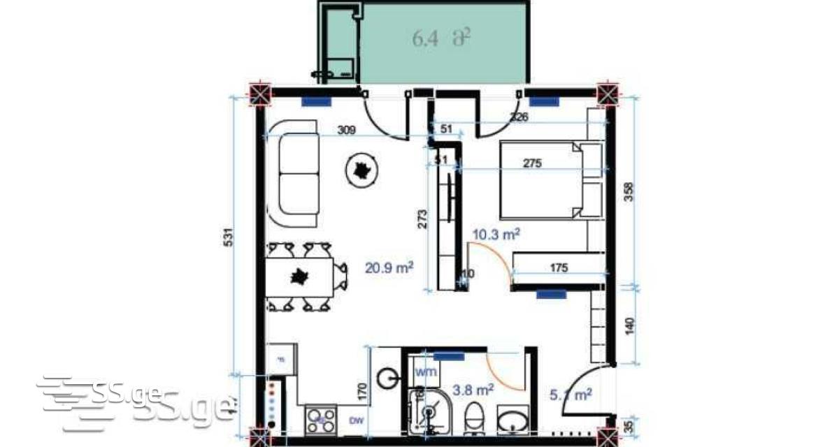 2-room, 1-bedroom apartment for sale in the "Your House in Samgori" complex, area 48 sq.m (6.4 sq.m. balcony). The balcony is tiled and has a closet where the heating boiler will be placed. An iron door is inserted in the entrance, a metal-plastic door is installed. window; natural gas and water are supplied to the apartment. The building is finished and handed over, internal renovations are in progress. The complex has 8,300 sq.m of recreational area, squares, children's spaces. 3 minutes walk from the subway.