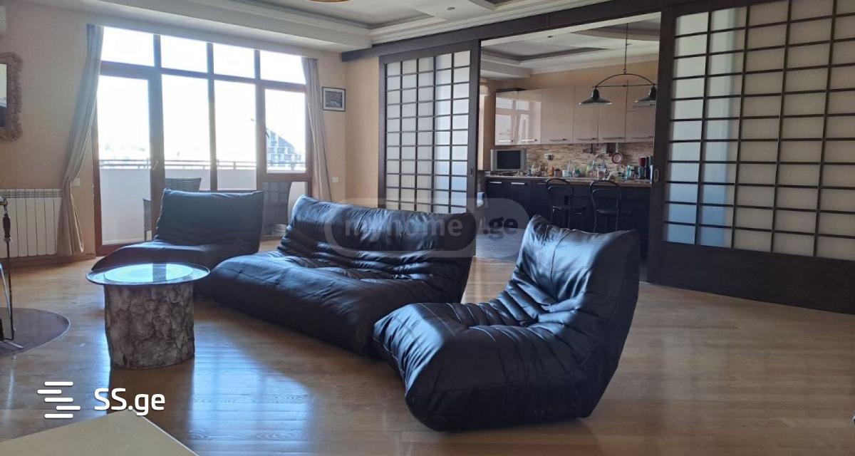 for sale in Vake,i. Chavchavadze Ave. 83, in the 'Vake Palace' residential complex, in an ecological and cozy environment, a studio of 100 sq.m. Apartment.The residential area is renovated according to the highest quality European standard:The room is covered with lacquered kopiti parquet made in Germany, and in the kitchen and the entrance there is plain colored ceramogranite made in Spain.The room has a working marble fireplace and powerful air conditioning.Kitchen fittings and massive built-in cabinets are made of Austrian MDF materials.The bathroom and toilet are equipped with an oversized built-in shower cabin with original Villeroy & Boch and Grohe hardware.The room and kitchen overlook the Nutsubidze slope, Lisi settlement and Tskneti highway.• Immediately in front of the building is a large well-furnished yard with children's slides, swings and training simulators.• On the first floor there is a SPAR supermarket and a Khilbostan shop.• Rev. The surrounding area of the complex