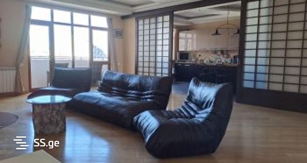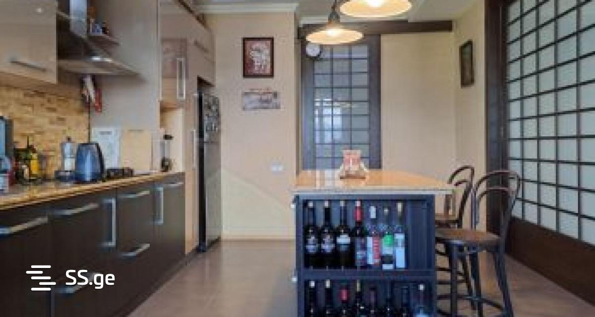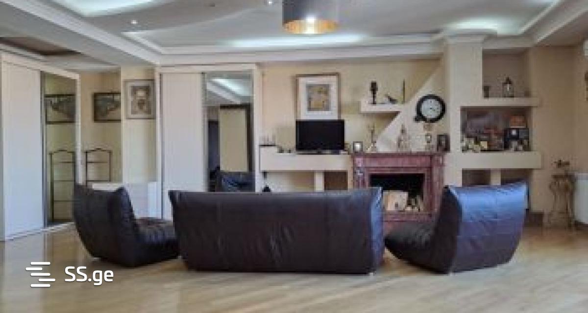 For sale in the plain, in an ecological and cozy environment, studio type 100 sq.m. Apartment. The living space is renovated with the highest quality European standard: the room is covered with German-made lacquered kopiti parquet, and in the kitchen and the entrance, plain-colored Spanish-made ceramic granite is laid. The room has a working marble fireplace and powerful air conditioning. Kitchen fittings and massive built-in cabinets are made of Austrian MDF materials. The bathroom and toilet are equipped with an oversized built-in shower cabin with original Villeroy & Boch and Grohe hardware. The room and kitchen overlook the Nutsubidze slope, Lisi settlement and Tskneti highway. • Directly in front of the building is a large well-furnished yard with children's slides, swings and training simulators. • On the first floor there is a SPAR supermarket and a Khilbostan shop.