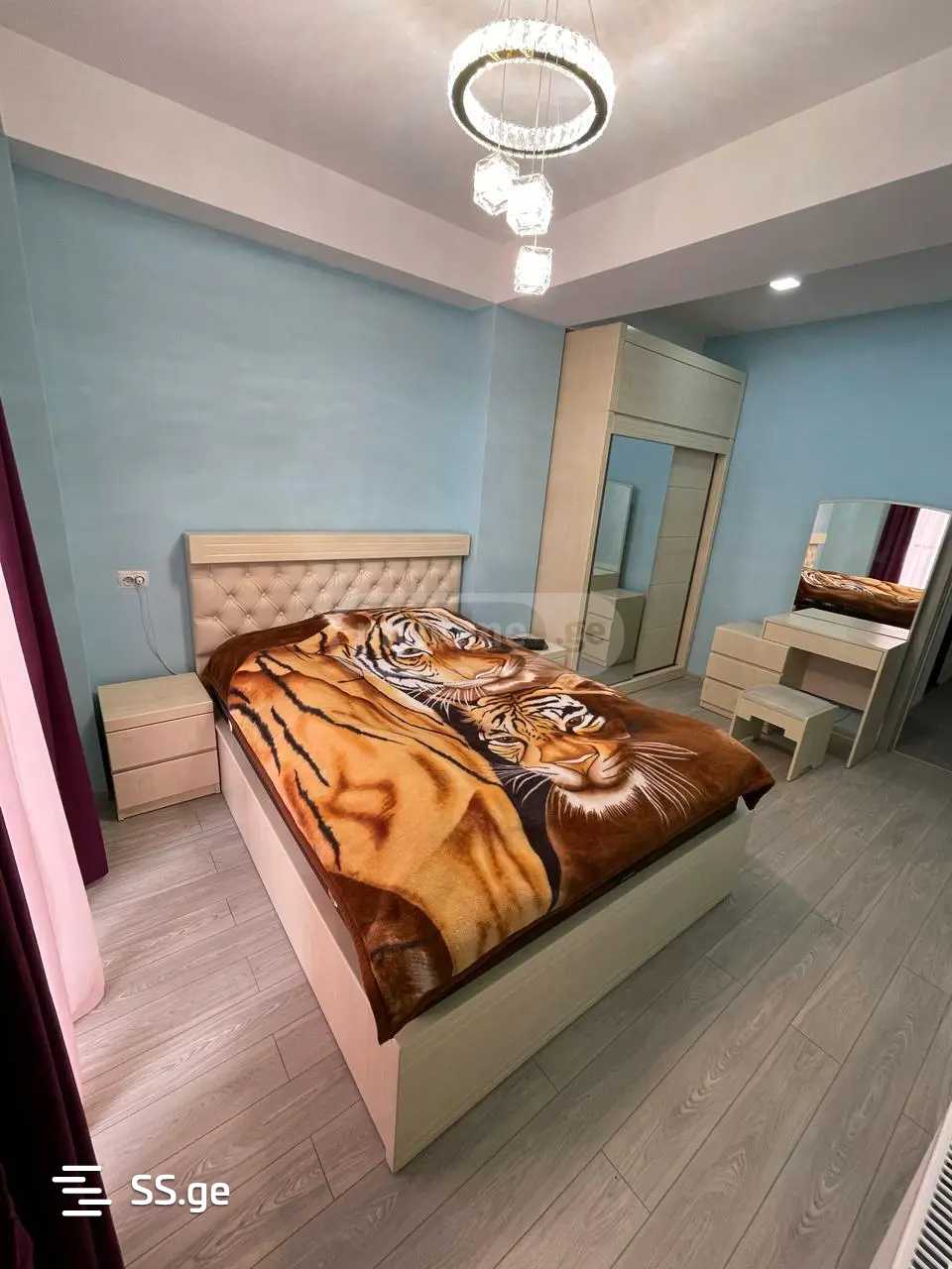 A newly renovated three-room apartment is for rent in a newly built building. 10 minutes away from Akhmeteli metro station.