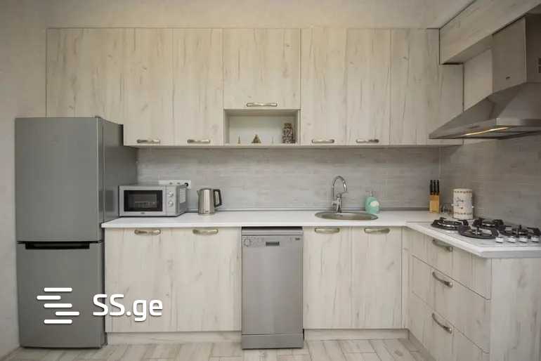 The apartment is equipped with all necessary furniture and items. The kitchen has a dishwasher and an oven.