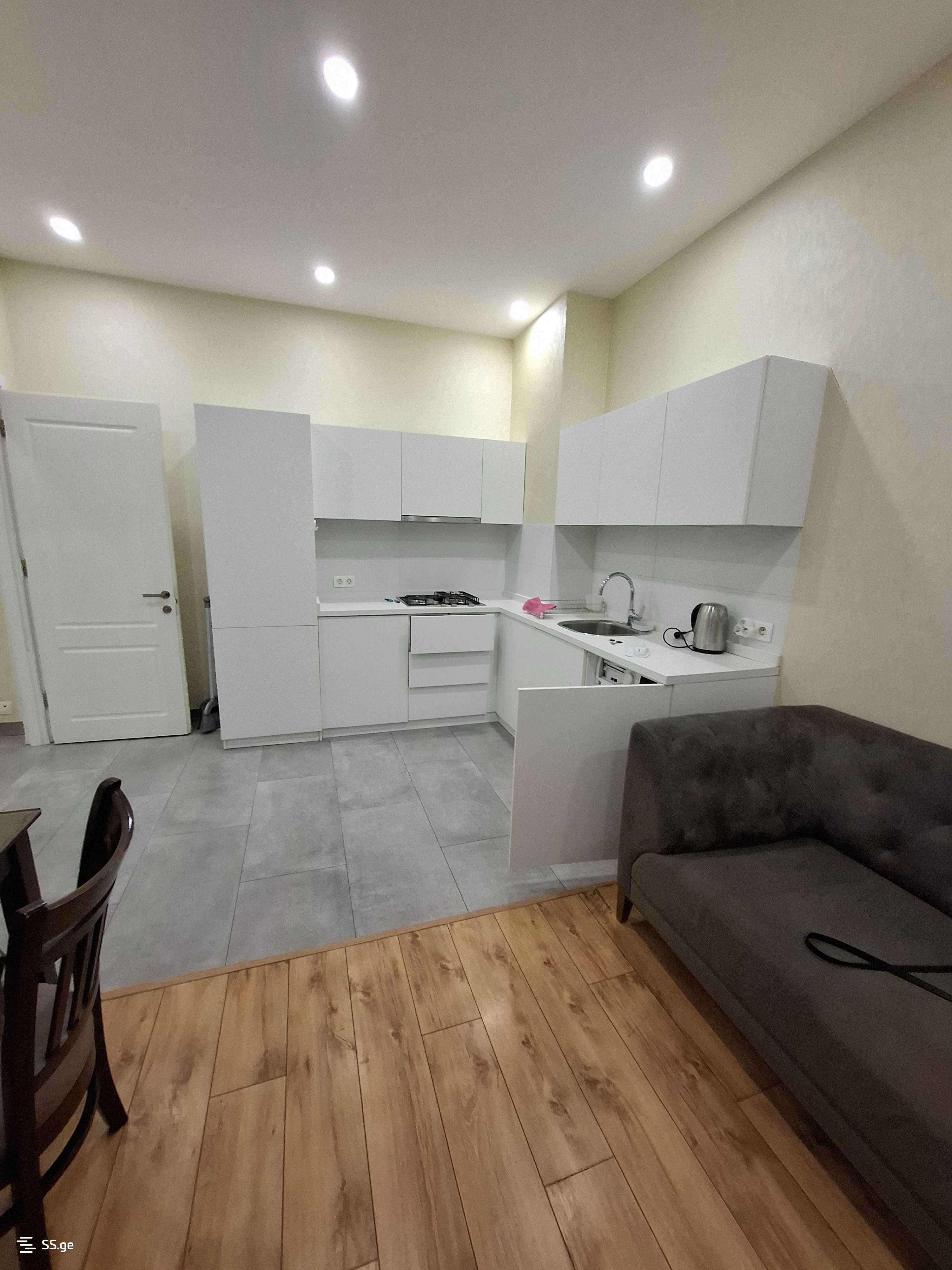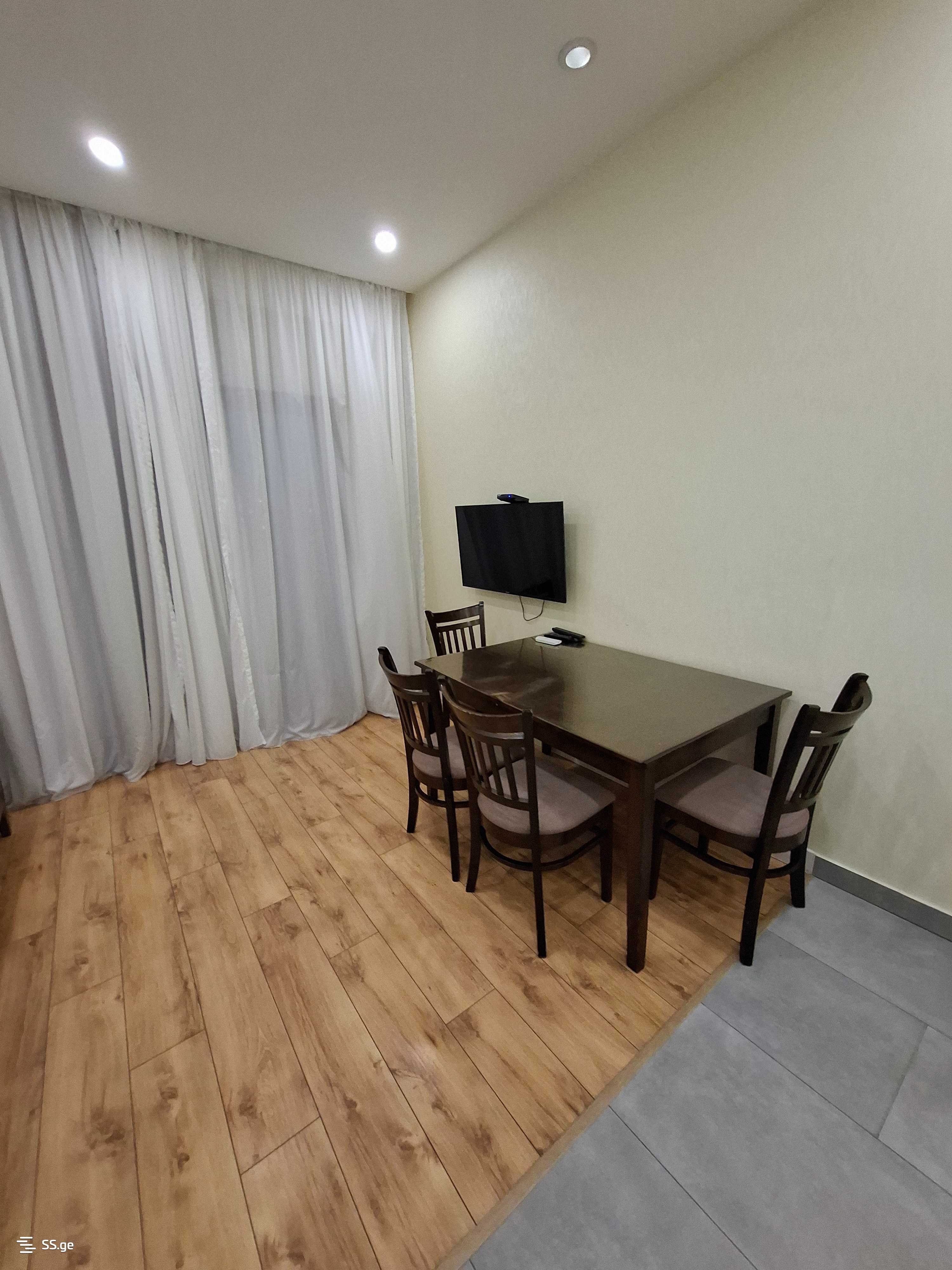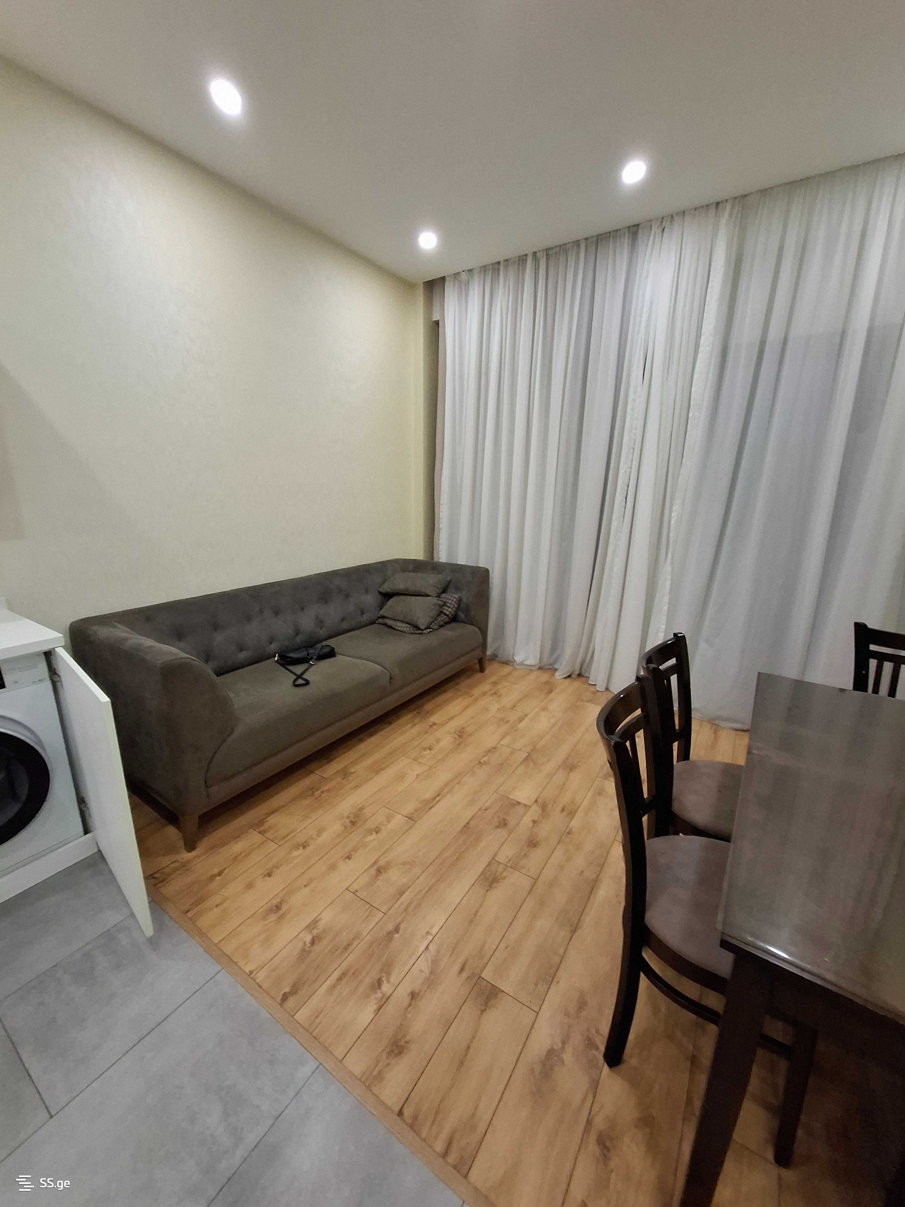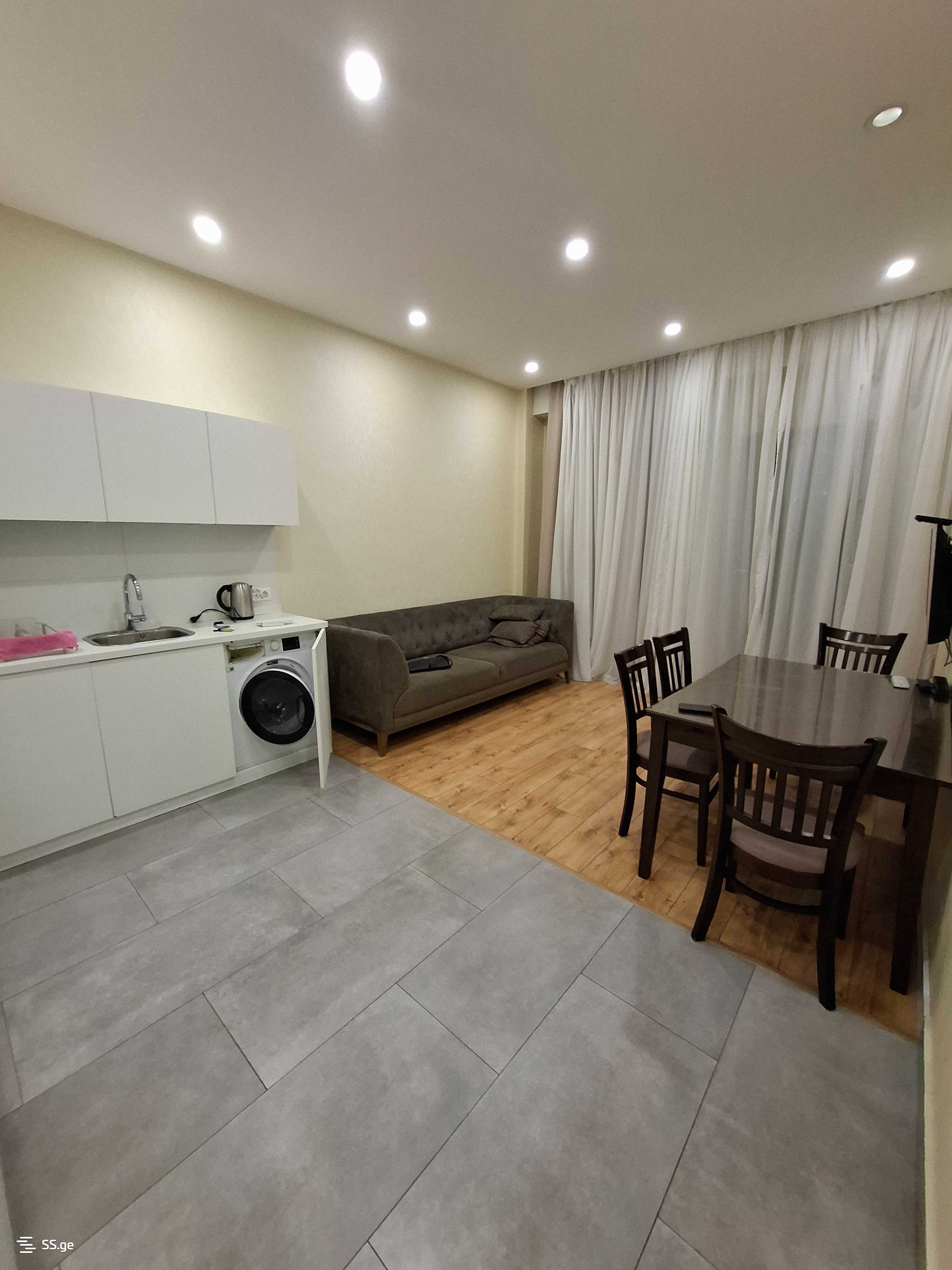 For rent in Saburtalo, in the Shanghai neighborhood, a newly built apartment with a balcony, three-room studio type, with two bedrooms, modern renovation, heating and air conditioning, furnished and equipped with appliances. Payment in advance for the first and last month.