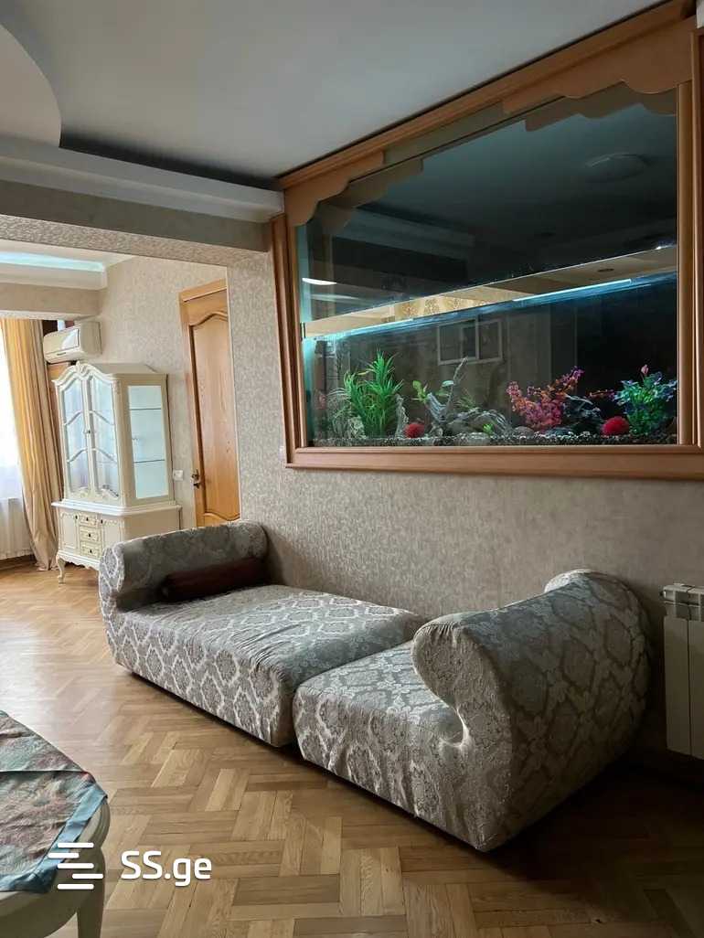 A well-furnished paradise apartment is for rent in Saburtalo, at the intersection of Pekini and Tsintsadze, at Tsintsadze 1. The apartment has two bedrooms, two bathrooms, a separate kitchen, and a large living room; each room has air conditioning, and the apartment has a parking space in the yard.