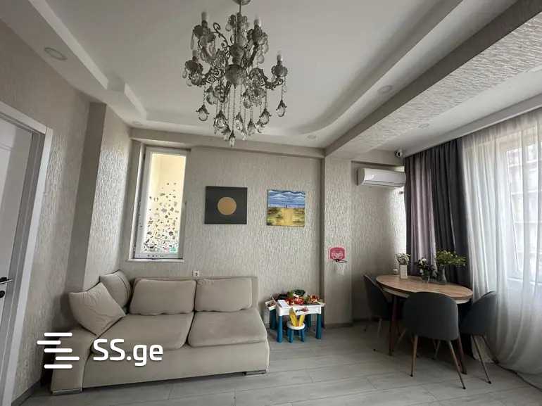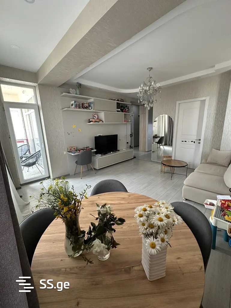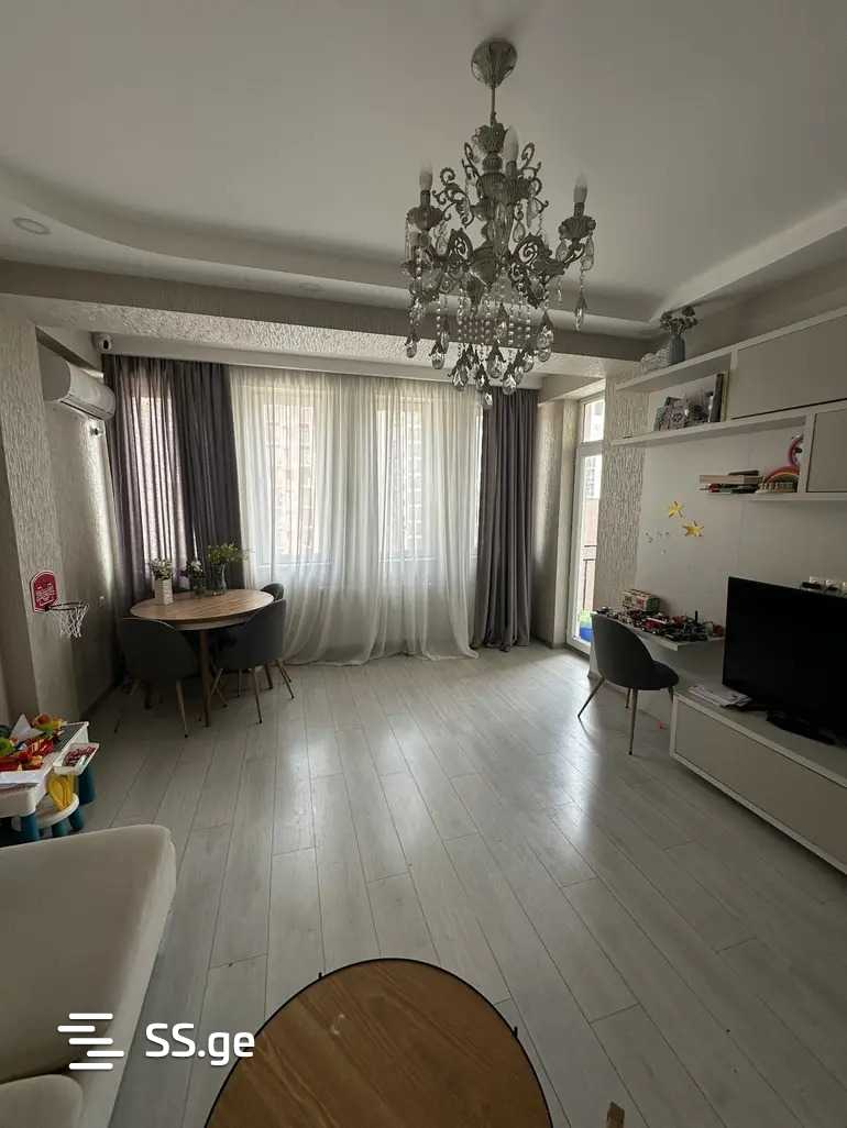 For sale is a 3-room apartment in Didi Dighomi. It has 2 bedrooms, a separate kitchen, and a living room. Both bedrooms have small balconies. All appliances and furniture remain in the apartment.