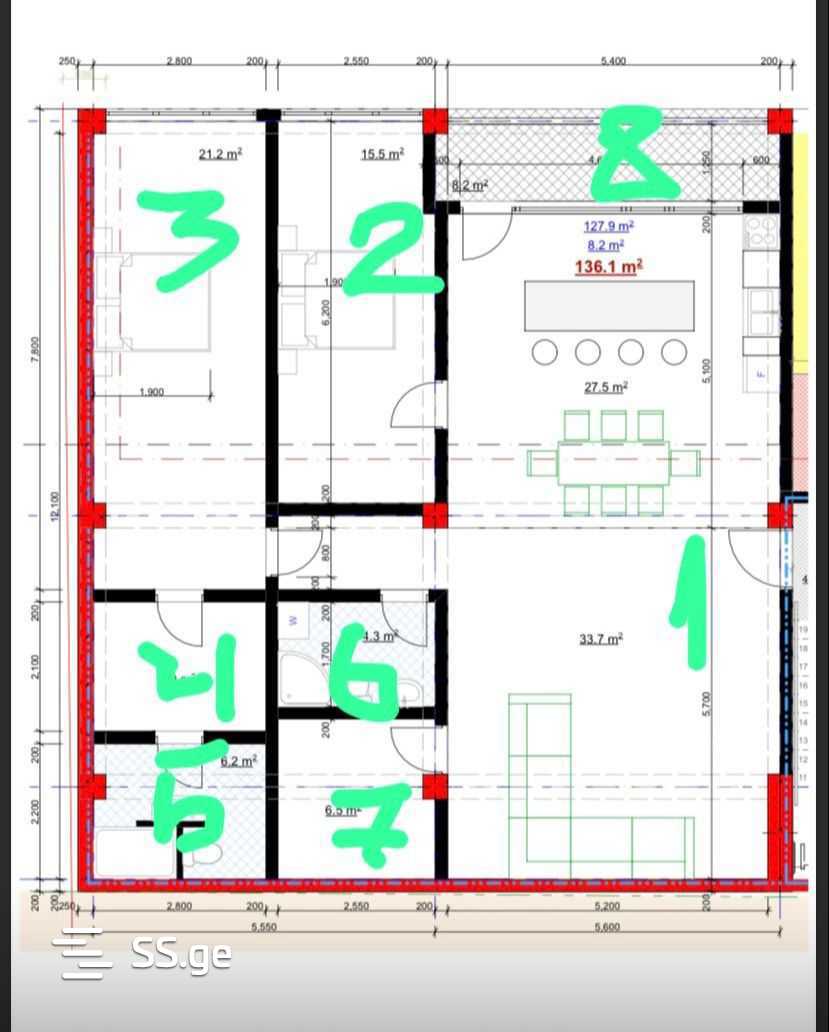 For sale in a prestigious area, A. Ioseliani 59, apartment, black frame 136 sq. m. The apartment has two bedrooms, one of the bedrooms will be a master (with its own bathroom), and a walk-in closet. There is one more room, it can be used as a pantry or a study. The apartment is currently undergoing renovation work, accordingly the price of the apartment will increase, if it is brought to the condition of the white frame before sale, the price will be $ 140,000 Green frame, with underfloor heating, the price is $ 150,000. The apartment is being sold by a construction company