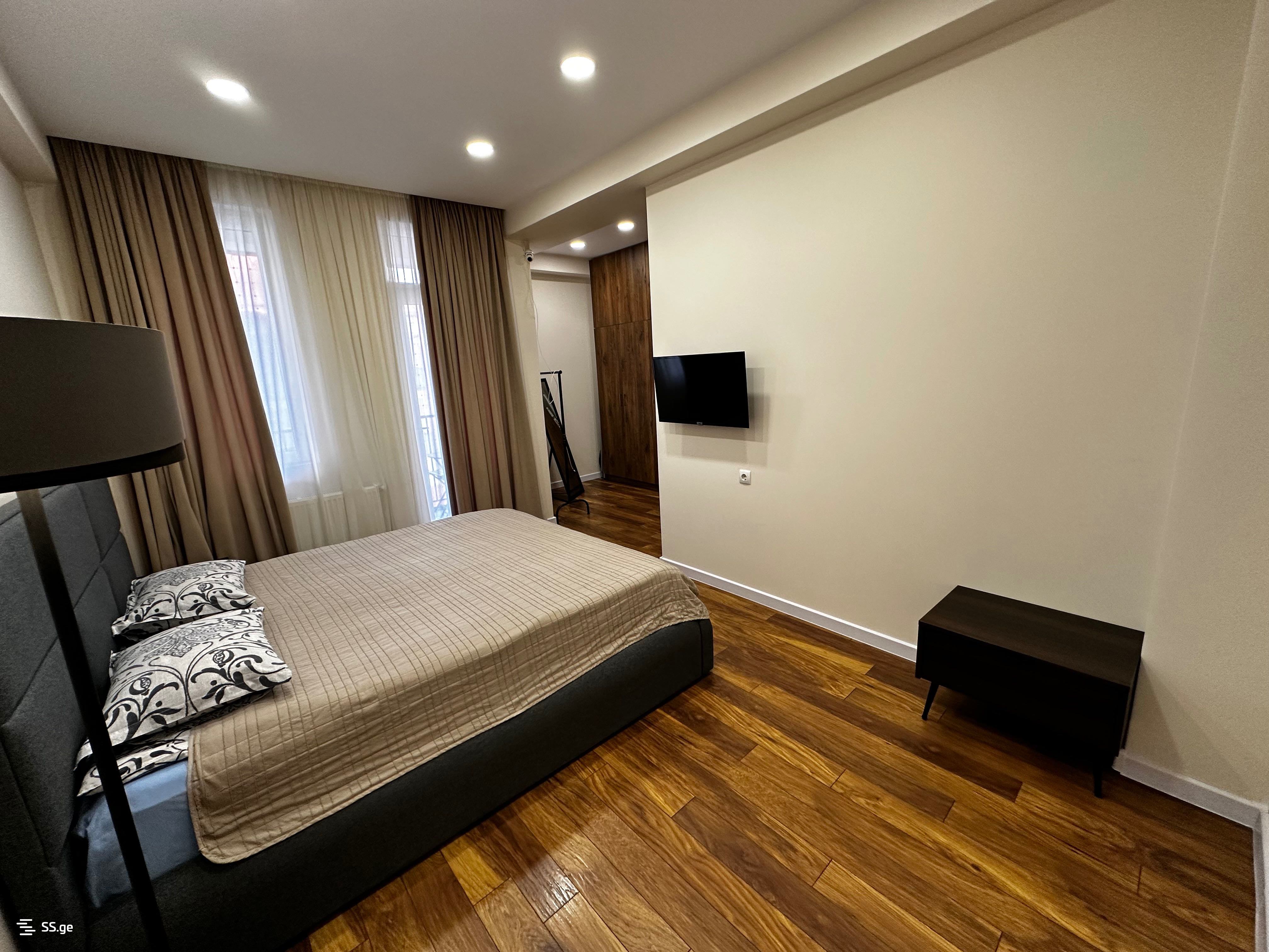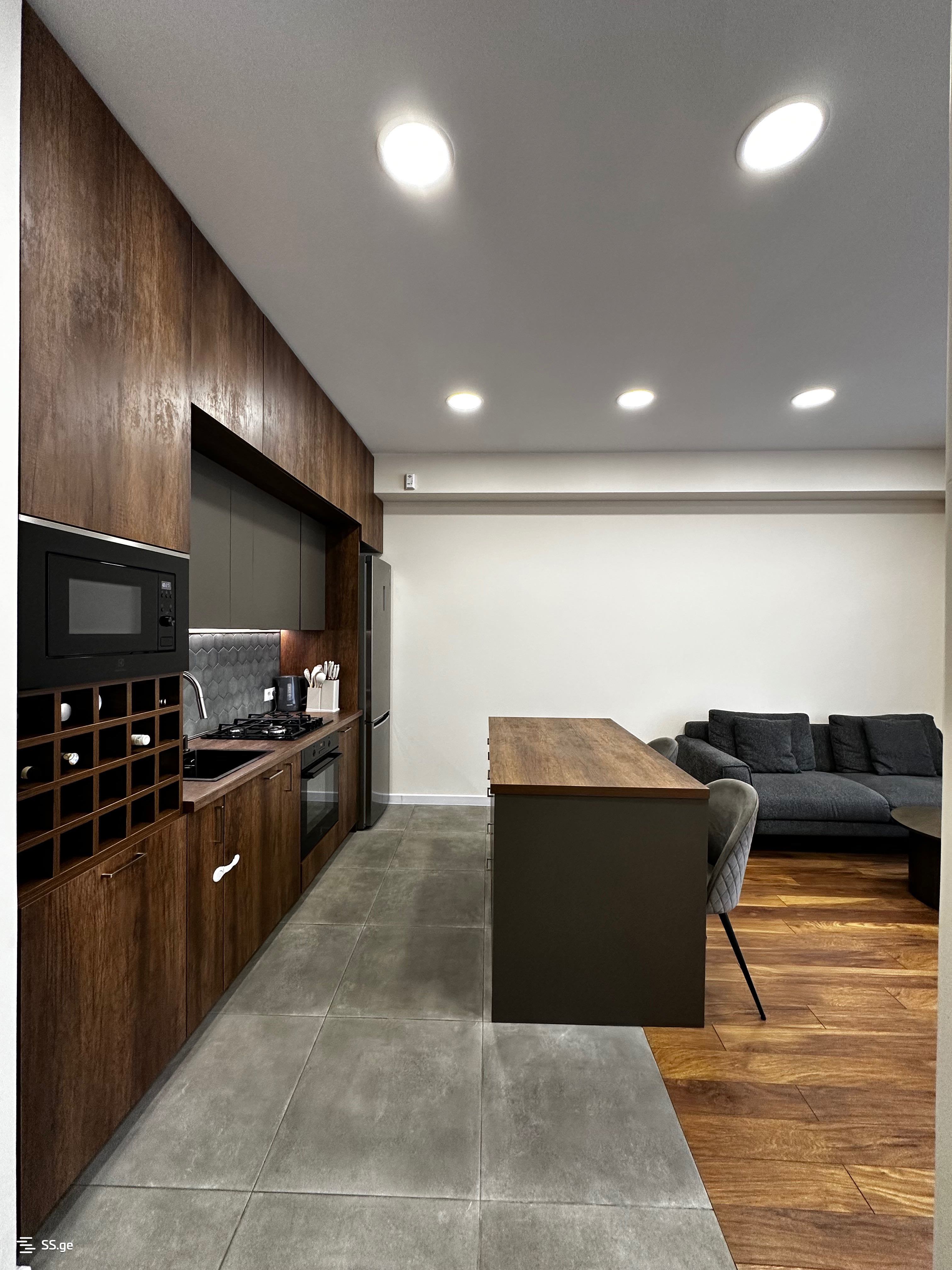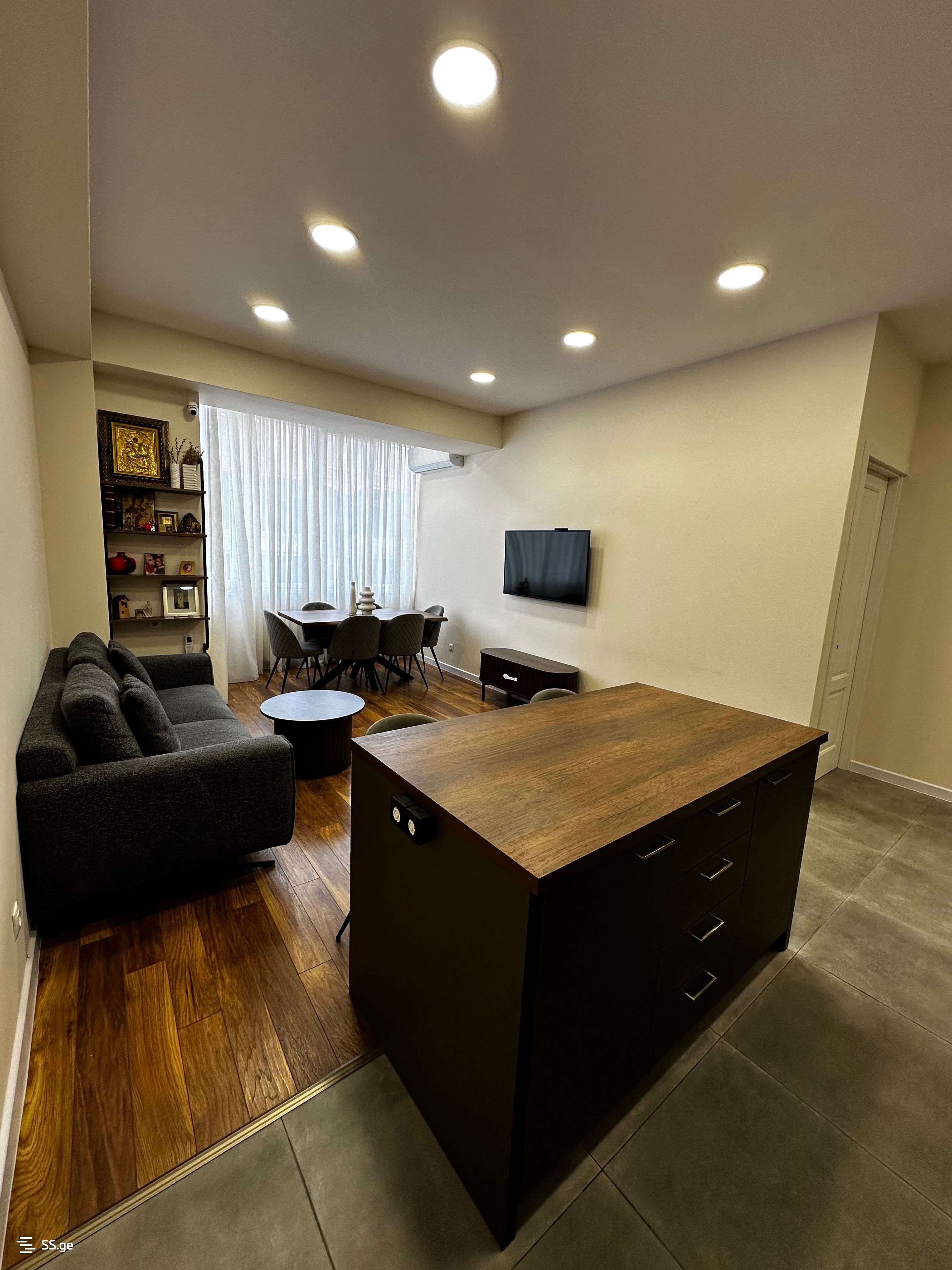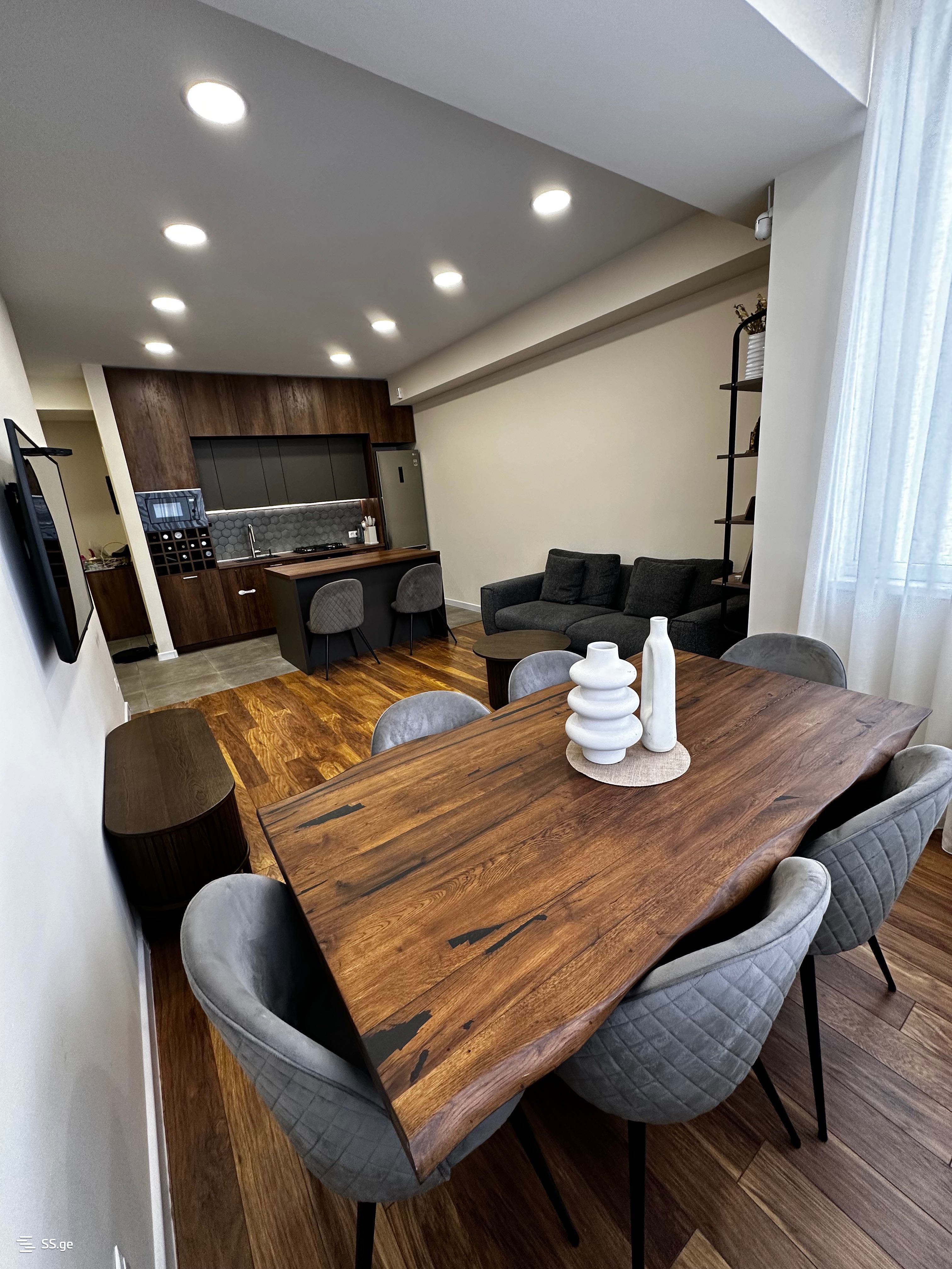 For sale is a newly renovated, fully furnished 3-room apartment with an area of 84 sq.m in one of the best and quiet locations of Vake, at the beginning of Nino Zhvania Street, in a newly built building. The apartment is located about a 10-minute drive from the round garden, in a quiet and comfortable environment.