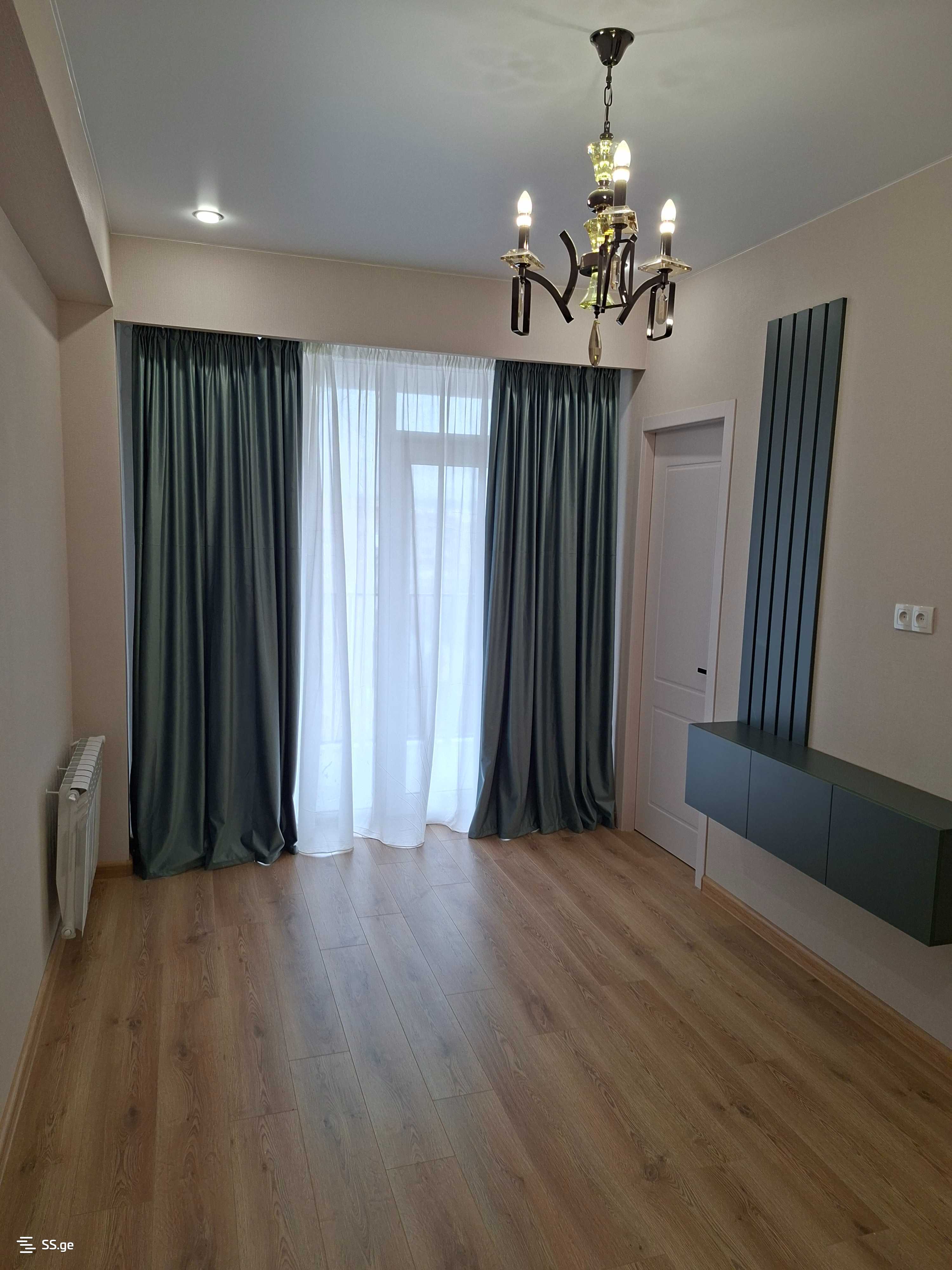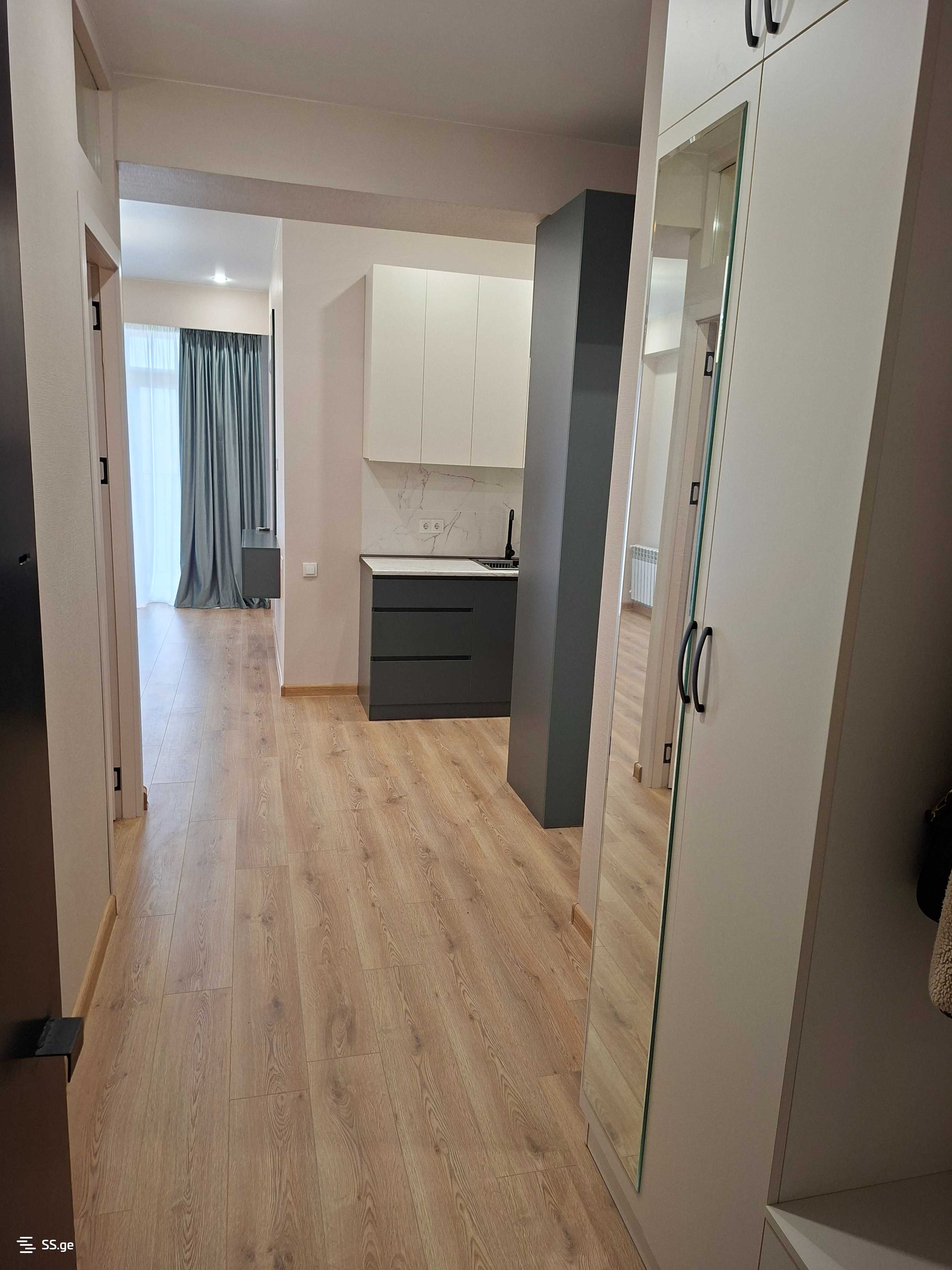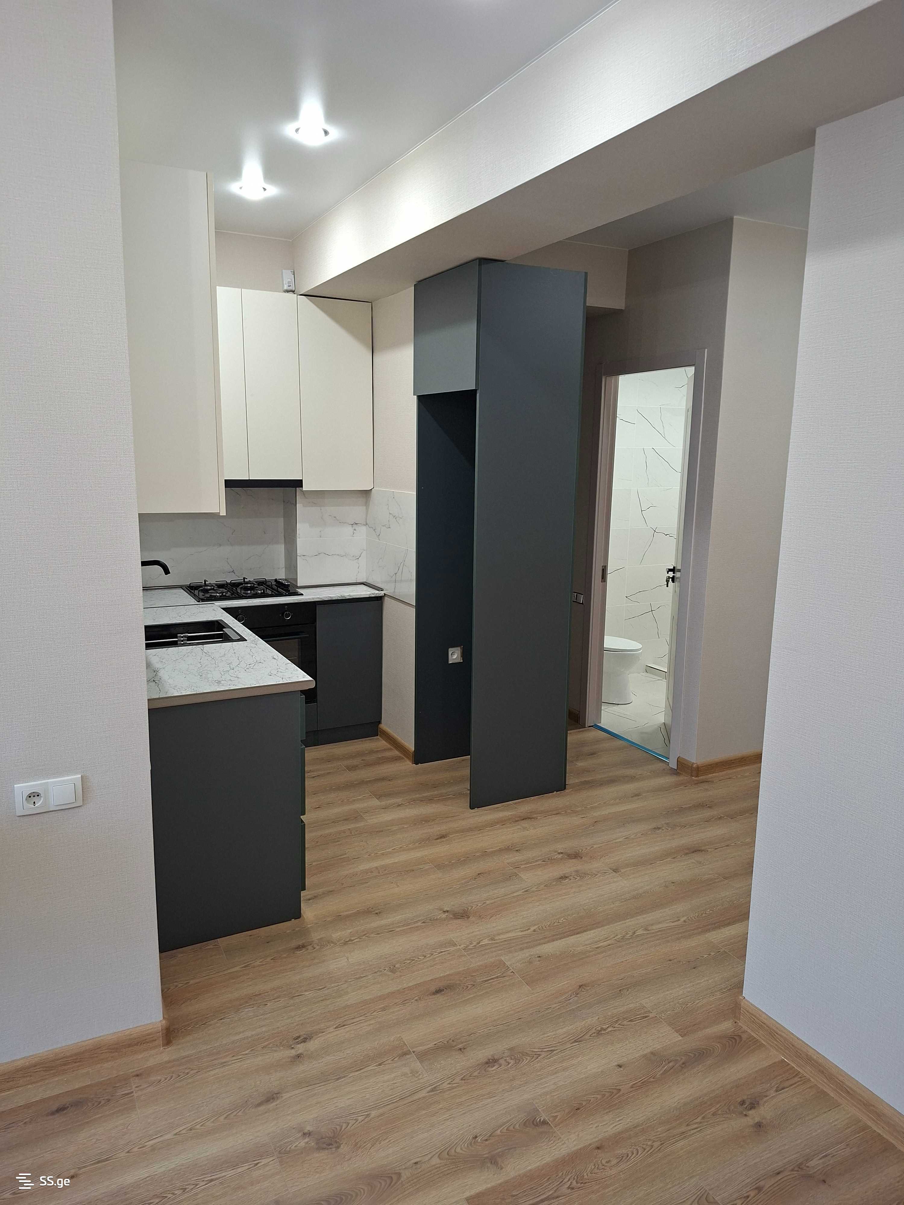 I am an owner, selling an apartment in a new building, a newly renovated apartment for a non-resident. The apartment is finished and located in Varketili. It is next to the Two Tones restaurant; everything is new, including the furniture and kitchen appliances. It has a yard with a barrier and a chip door.