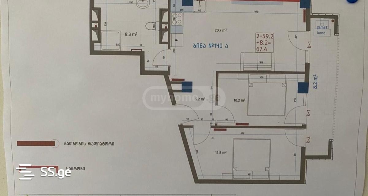 Terrace building, near Gldani administration. with 2 bedrooms. The billing amount has been paid. Heating pipes are laid out. The building is finished.