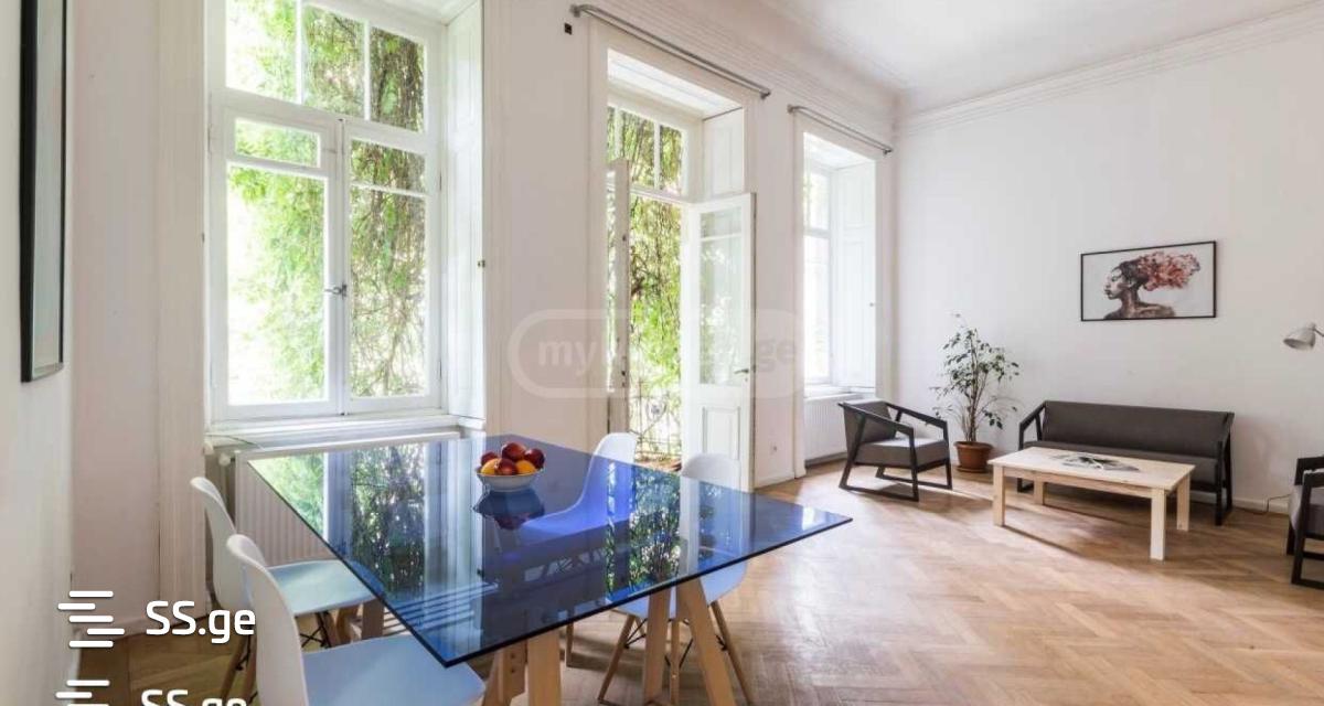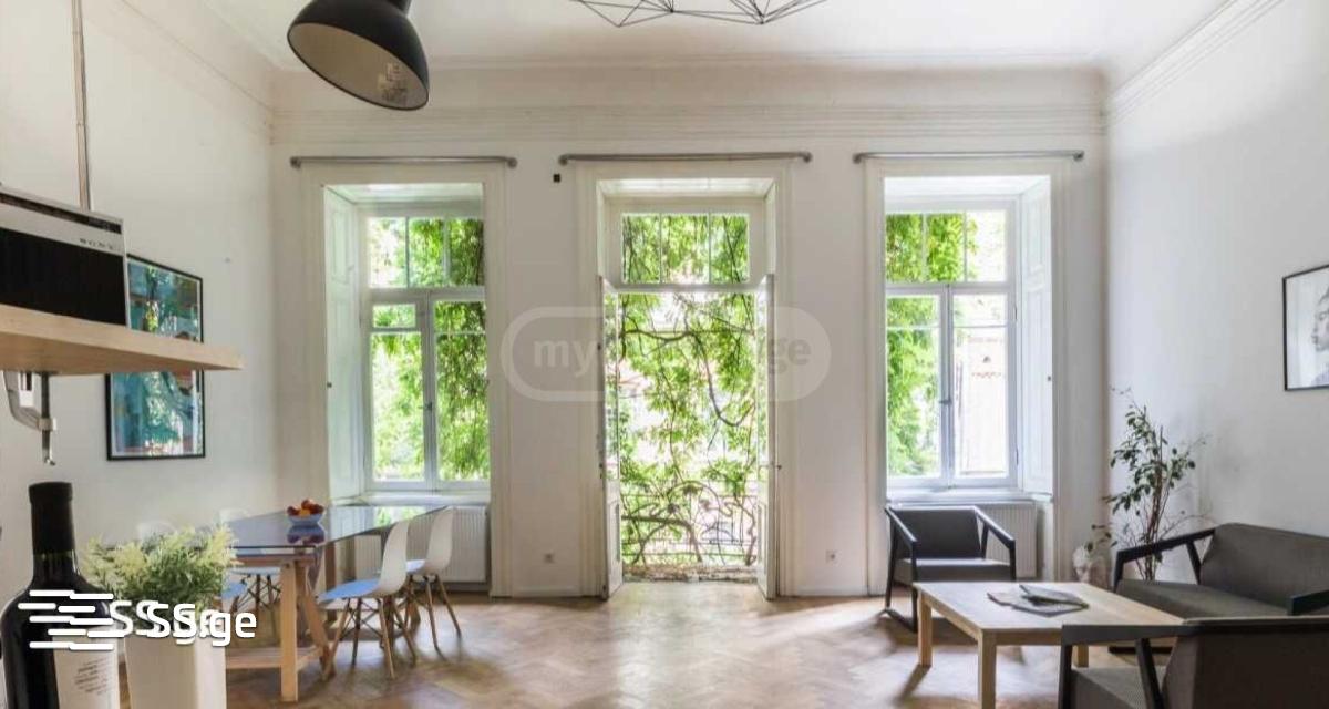 Large bright south facing apartment with balcony in historic house. The house was built in 1905 and thus has the status of a monument. Large room 45m2, bedroom 13m2, dining room 18m2, kitchen 10m2, bathroom toilet 10m2. 4 meter ceiling height. Original sash windows and oak floors. garage. Basement 30m2. High second floor.