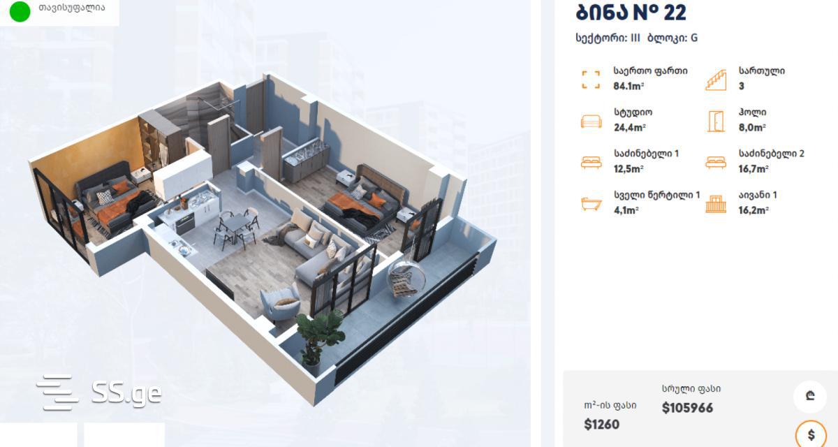 შეიძინეთ ბინა სააქციო ფასად. 105 966$ის ნაცვლად 95 874$ად.პროექტი სრულდება 2024 წლის ბოლოს. ბინა ბარდება თეთრი კარკასის მდგომარეობაში. პროექტის ფარგლებში აშენდება აუზი კორპუსებს შორის, რომელიც იქნება საერთო მოხმარების, შიდა ტერიტორიაზე გადაადგილება შესაძლებელი იქნება მხოლოდ ფეხით.შესაძლებელია შიდა განვადებაც.