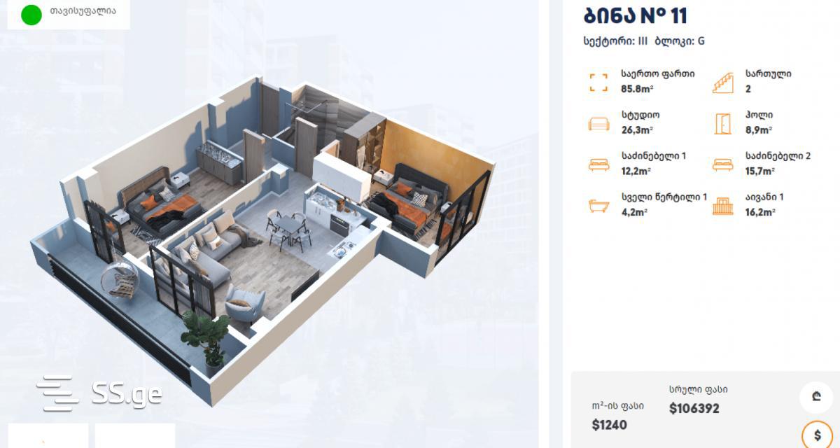შეიძინეთ ბინა სააქციო ფასად. 106 392$ის ნაცვლად 97 812$ად.პროექტი სრულდება 2024 წლის ბოლოს. ბინა ბარდება თეთრი კარკასის მდგომარეობაში. პროექტის ფარგლებში აშენდება აუზი კორპუსებს შორის, რომელიც იქნება საერთო მოხმარების, შიდა ტერიტორიაზე გადაადგილება შესაძლებელი იქნება მხოლოდ ფეხით.შესაძლებელია შიდა განვადებაც.