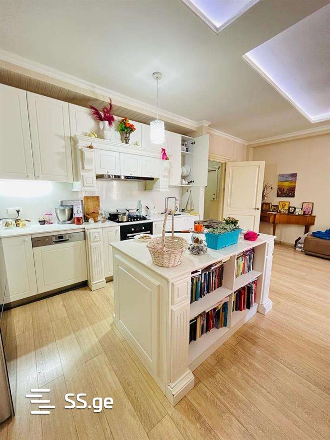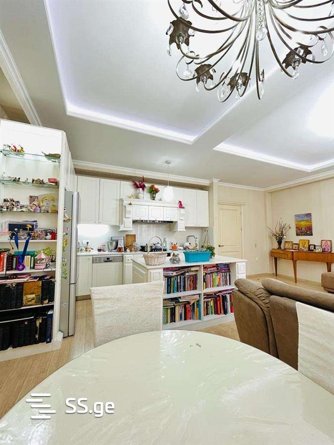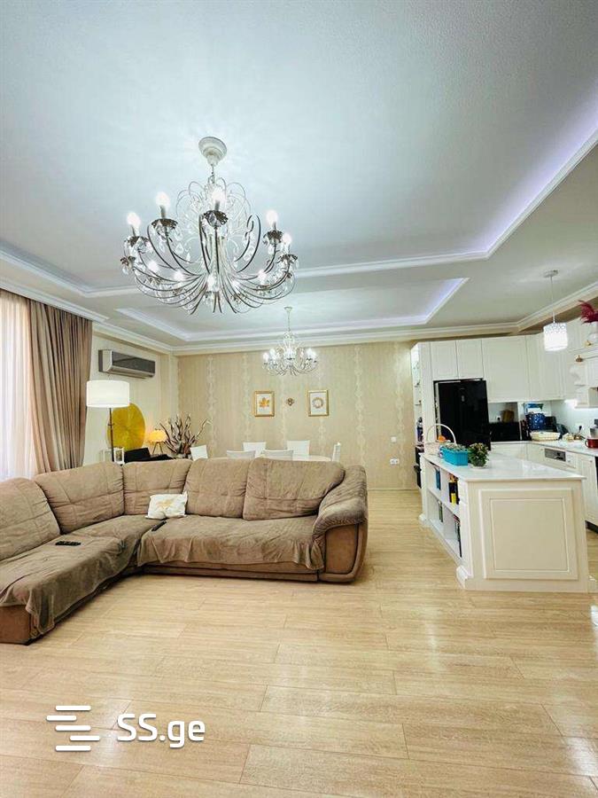 3-room, 114 sq.m. apartment for sale in Saburtalo, Azimut house. Hall, large living room and kitchen, 2 bedrooms, 2 bathrooms, 1 large balcony, both bedrooms and living room open onto the balcony. The apartment has undergone high-quality, expensive repairs, the kitchen furniture and appliances remain, as well as the built-in furniture in the hall. Cameras and security 24/7.