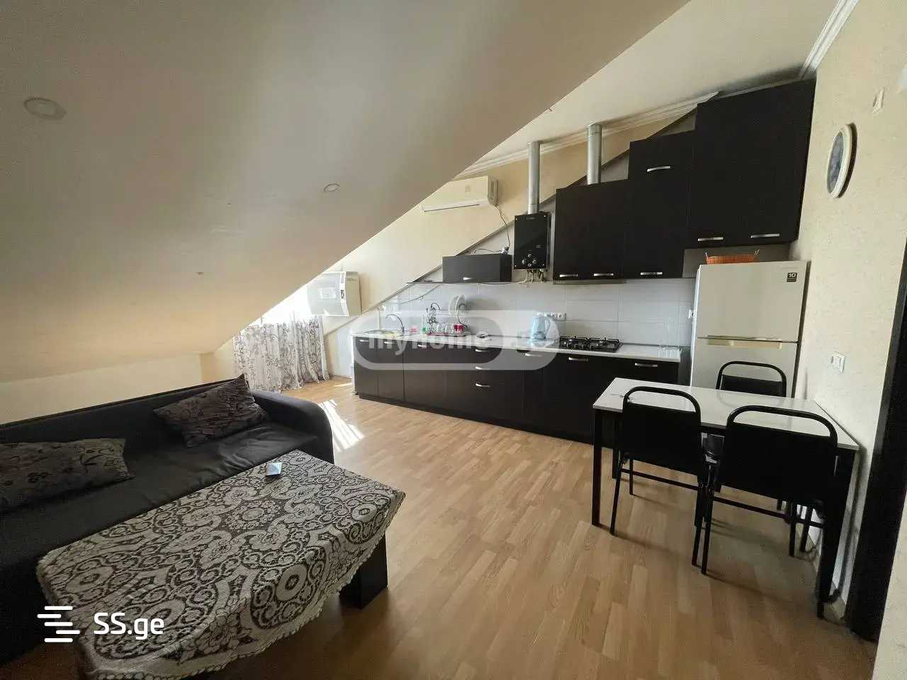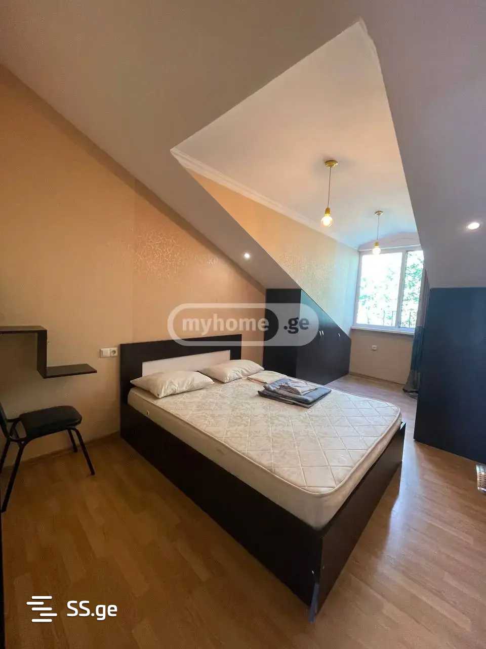 For rent in Saburtalo, attic type, studio with a separate bedroom, furnished and equipped with appliances, it is a 4-storey building with a capital foundation, there is no elevator, the price is $450.