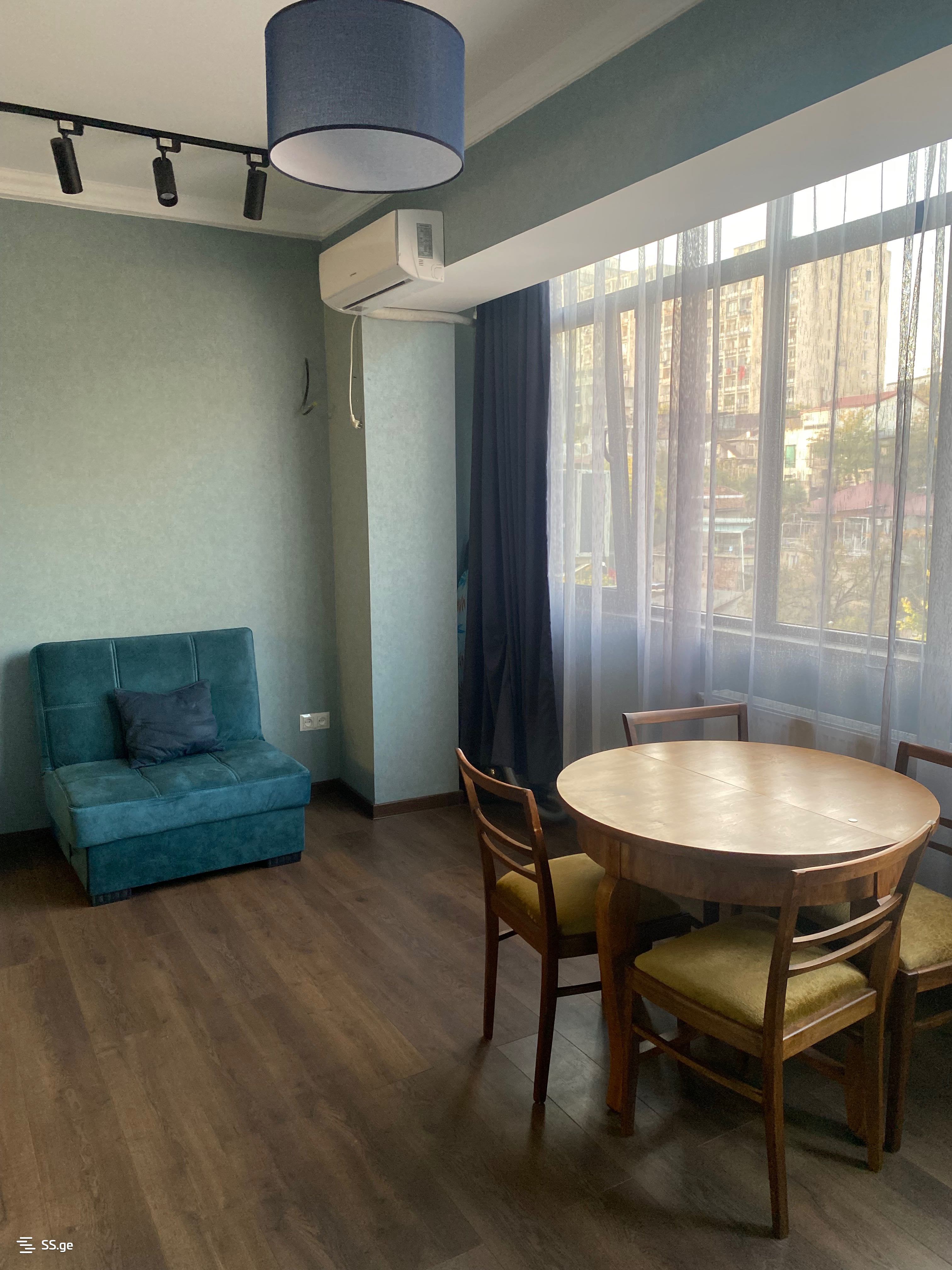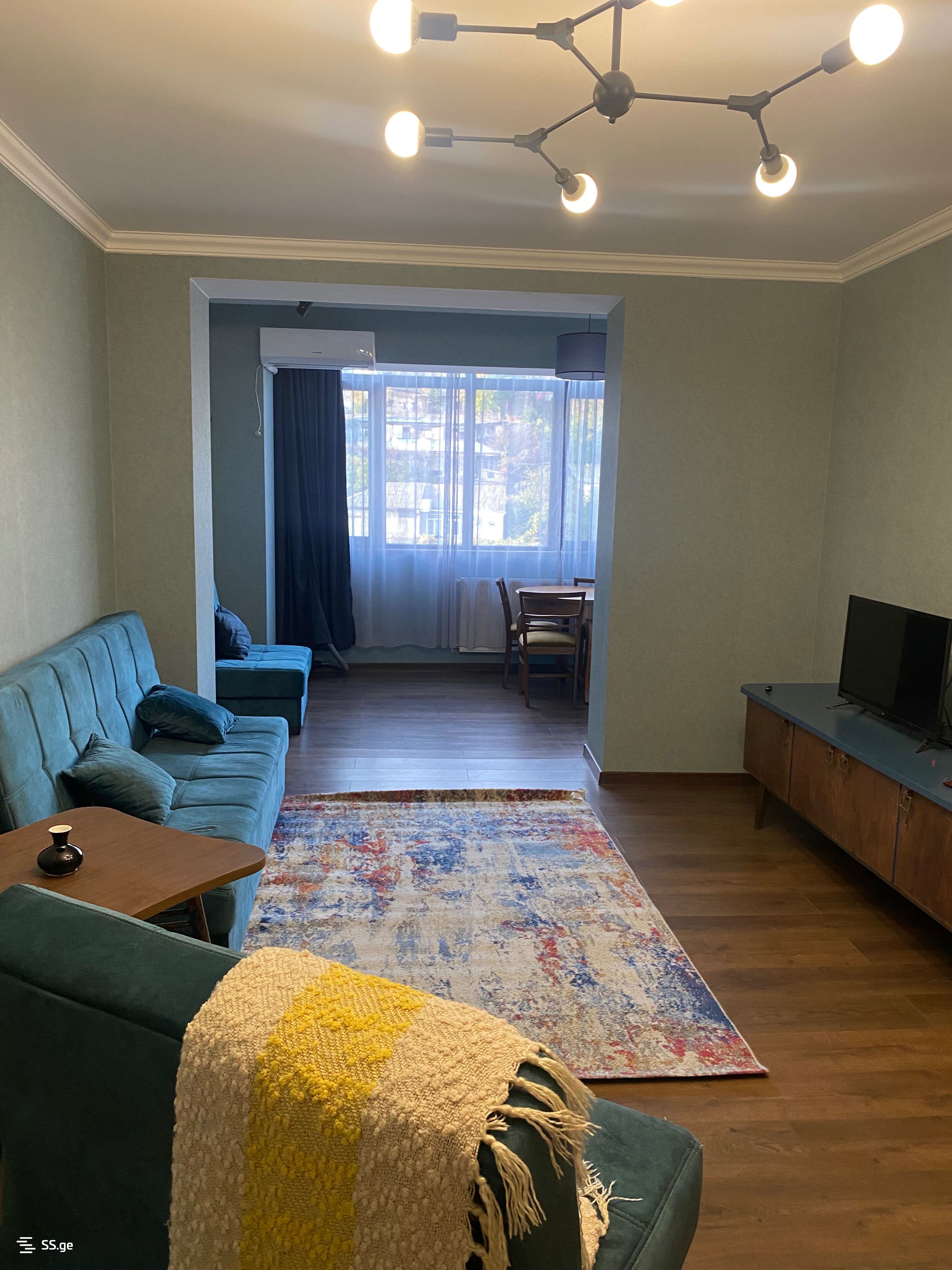 From October in Saburtalo. An 8(8) 2-room apartment with a loggia is available for rent on Dolidze Street, fully renovated and furnished with all necessary furniture and items.