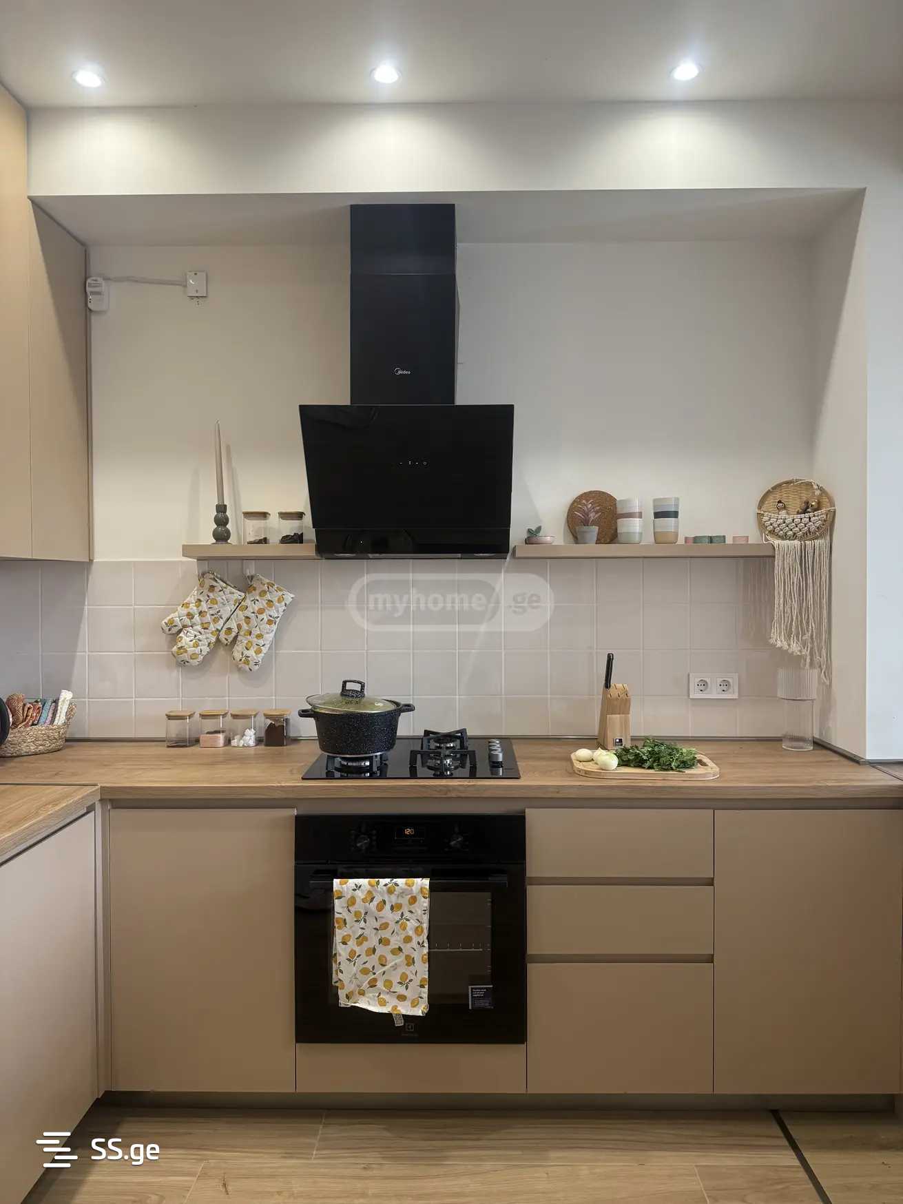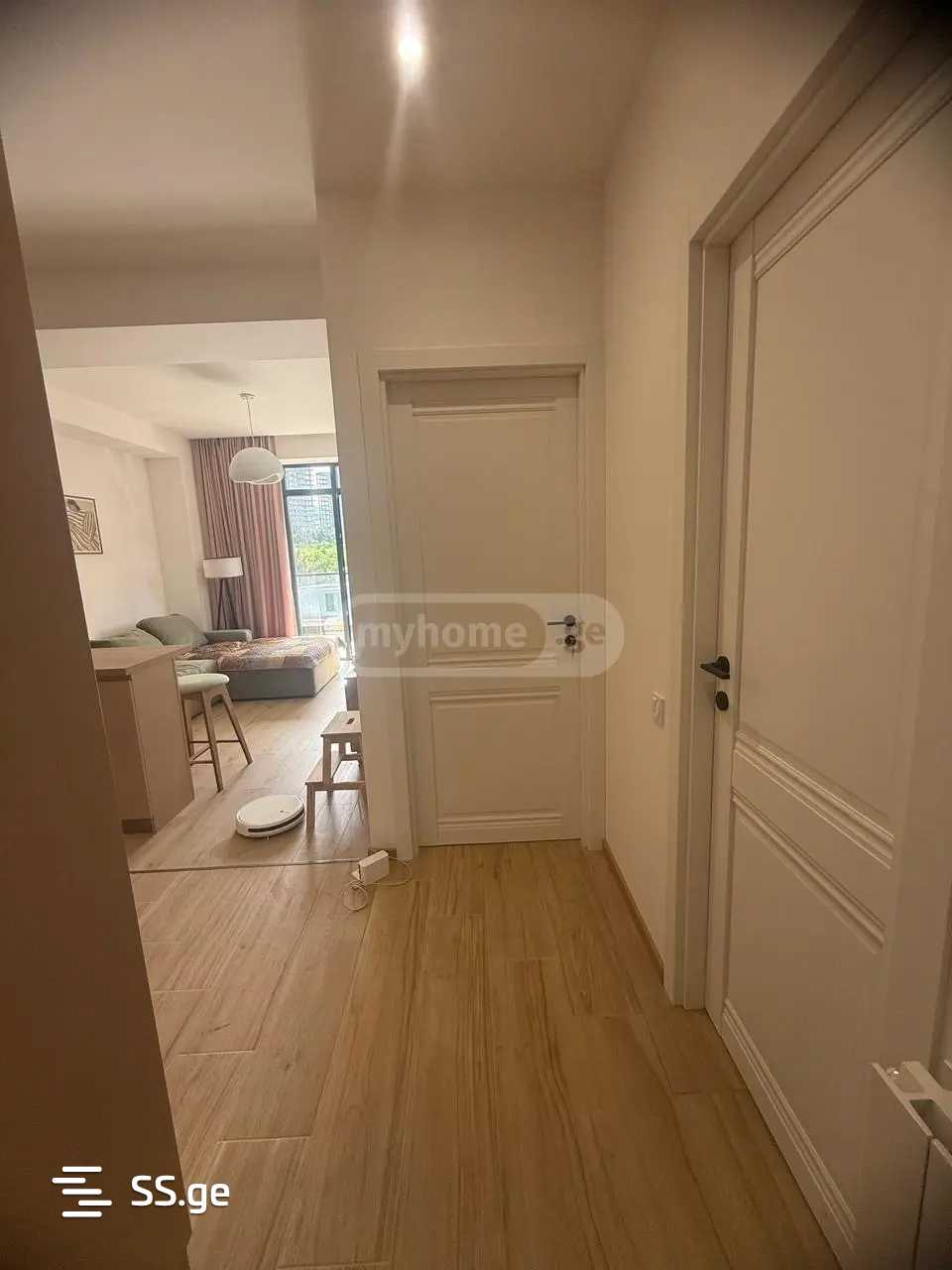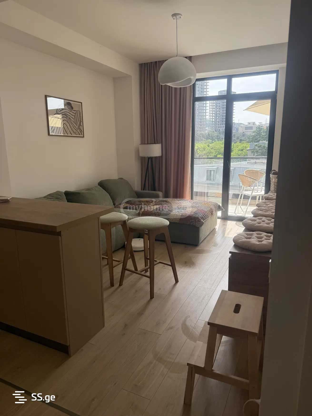 A newly renovated studio with one bedroom is for rent on Archi Kavtaradze starting in September. The total area is 55 square meters, of which the balcony is 12 square meters. It's on the seventh floor with a front view. The apartment is equipped with all necessary items and appliances, including a dishwasher.