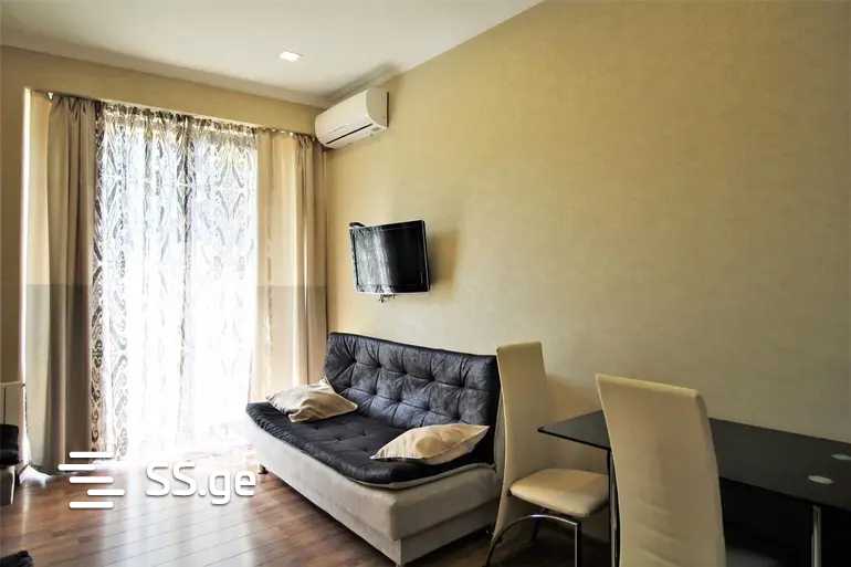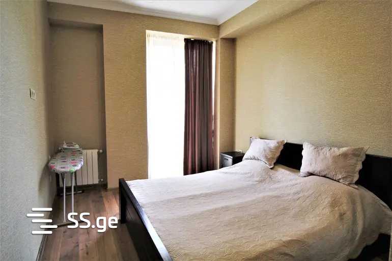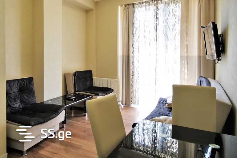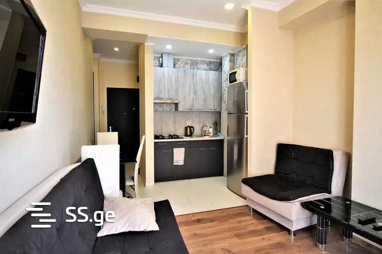 A two-room renovated apartment is for rent at Simon Chikovani (Khiliani) 25, on the third floor of a newly built building. The apartment is furnished with all kinds of furniture and appliances.