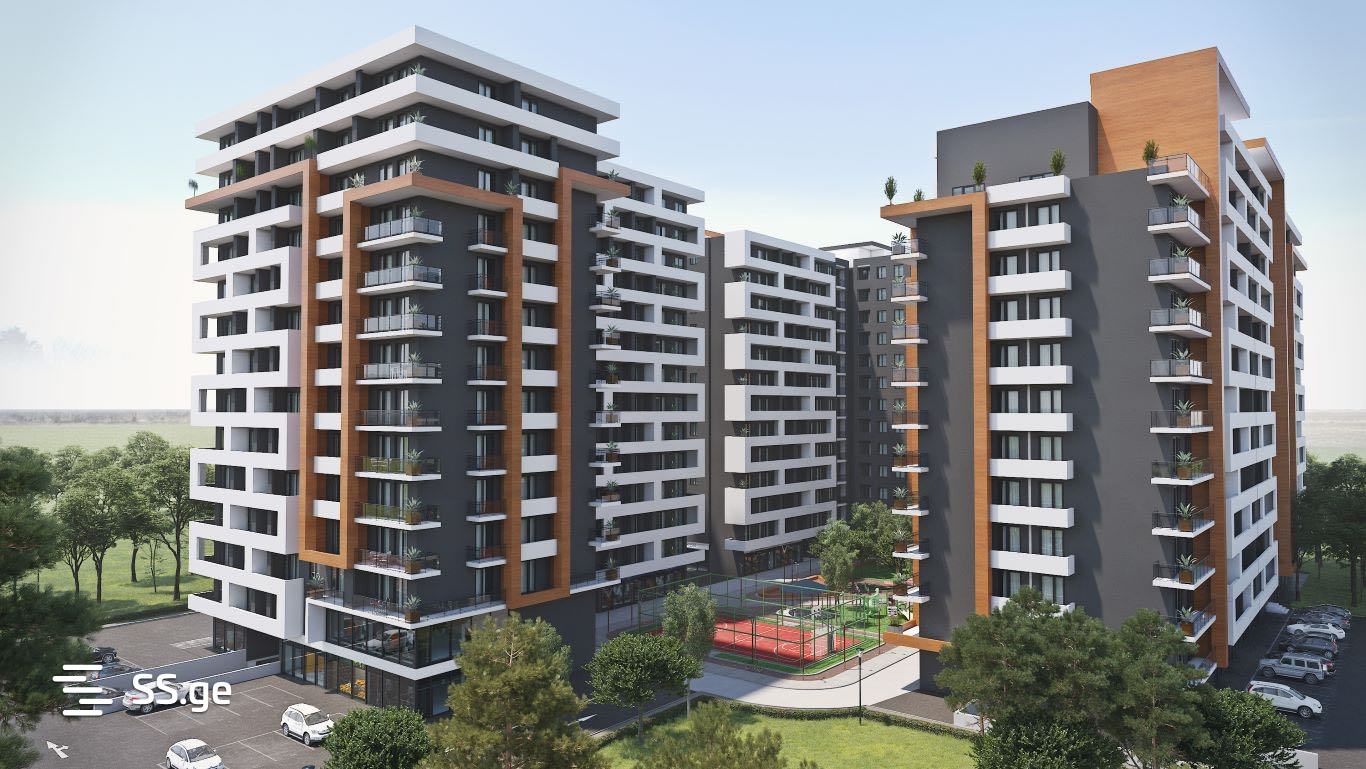 An apartment and garage are for rent on the 1st floor of the premium class company Grada's 'five-star' residential complex 'Green Alley' near Dighomi Gudvil. The apartment is equipped with modern furniture and appliances, a closed yard, 24-hour security, and cameras.