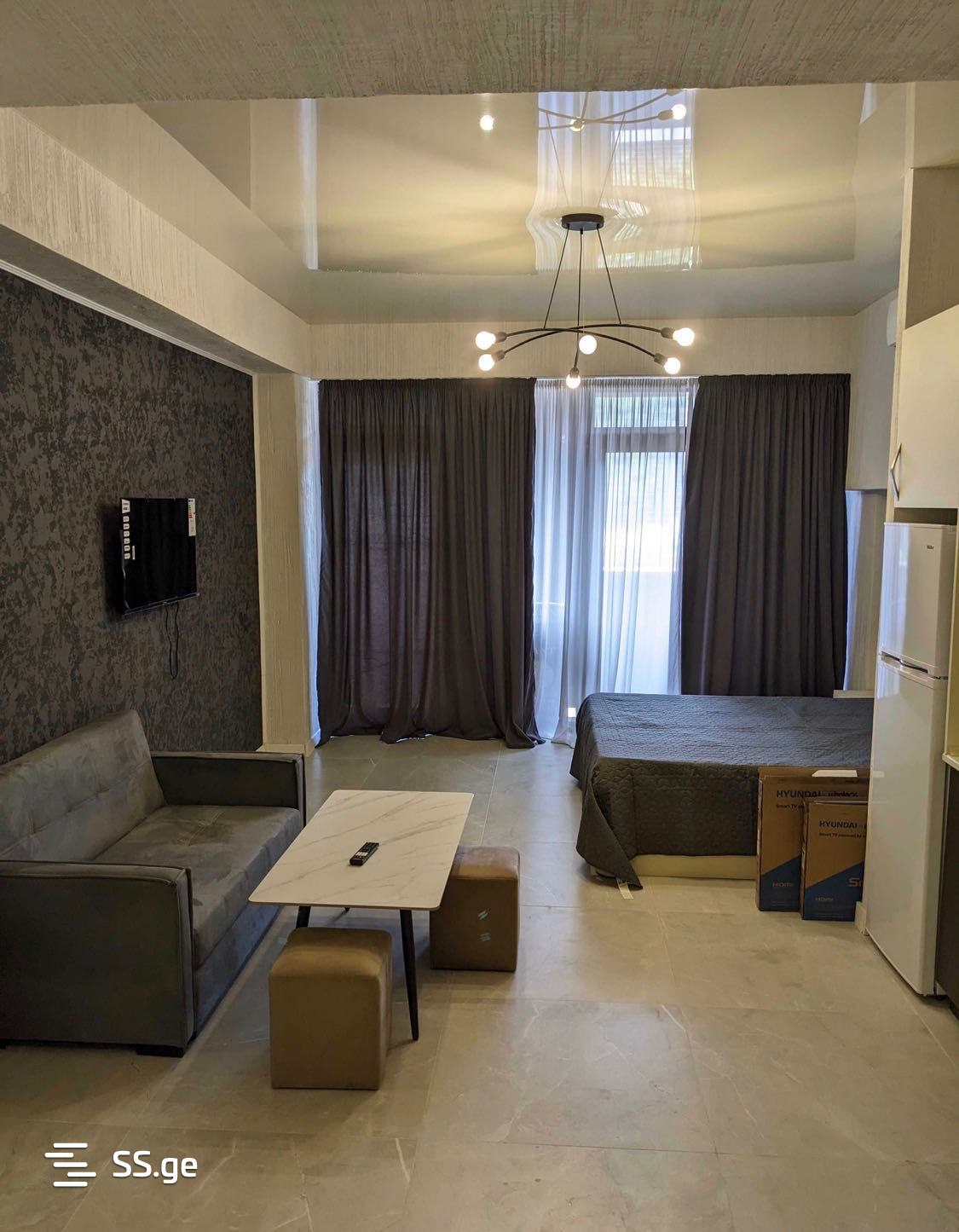 A one-room studio apartment is for rent in the premium class building of Demax on Politkovskaya Street (formerly Jikia Street). The apartment has been newly renovated and is uninhabited. The apartment has all necessary furniture and appliances.