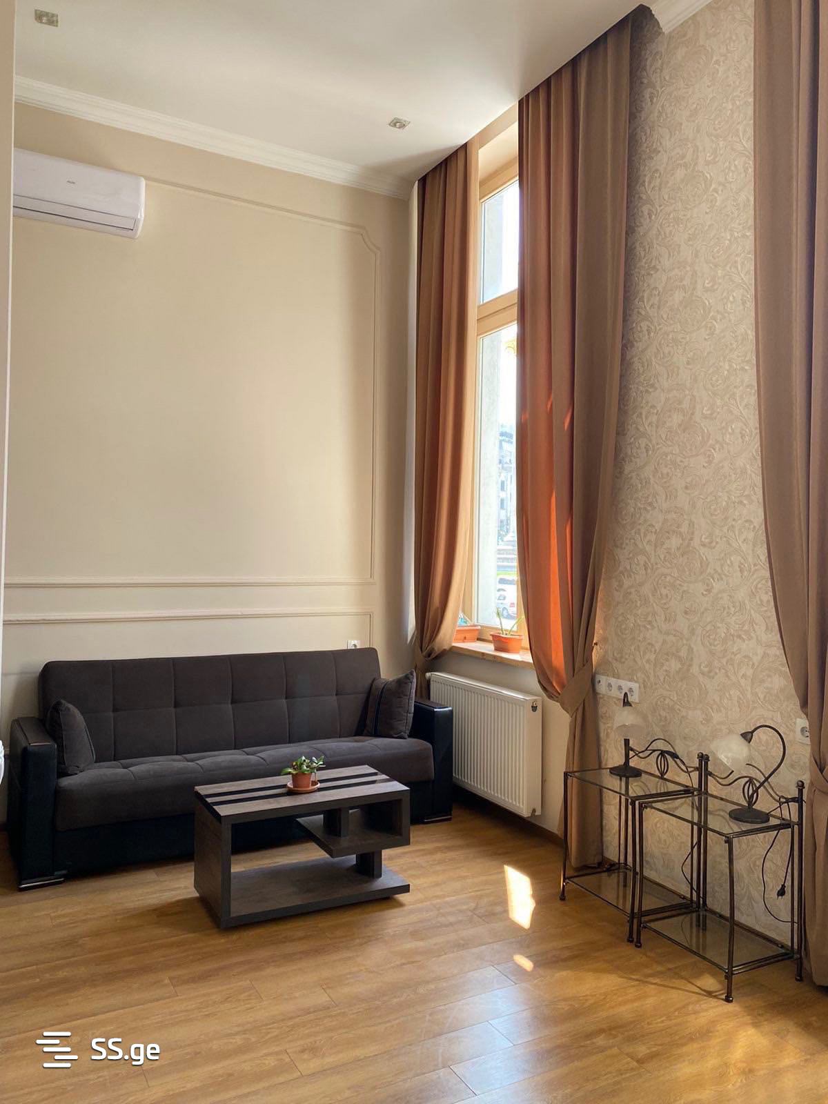 For rent in Tbilisi, in the city center, with a view of Freedom Square, a two-room, high-ceilinged, renovated apartment with a kitchen, central heating, natural gas, two air conditioners, bathrooms, and furniture. Prepayment for the first and last month.