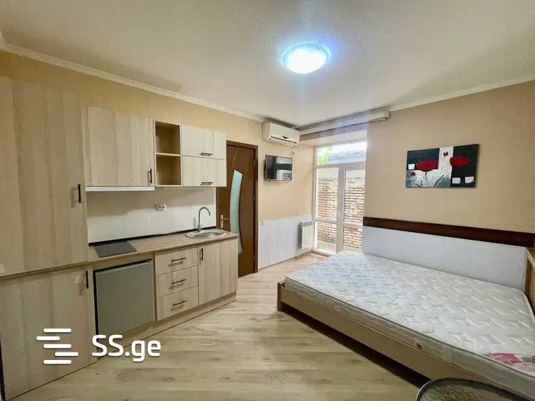 For rent: studio-type apartment in Chughureti, at 4 Louis Pasteur Street. A 5-minute walk from Marjanishvili metro station. The apartment is furnished and equipped with appliances. With renovation.