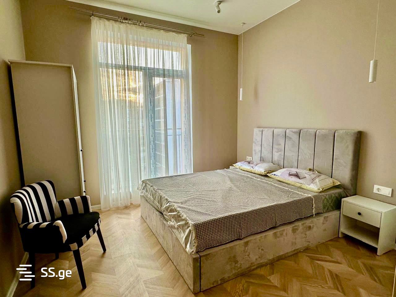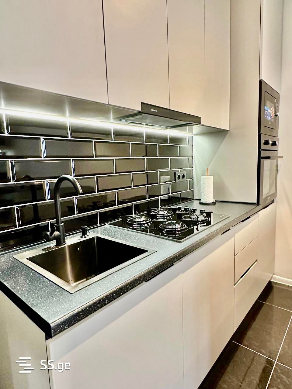 There is a large private yard protected by a barrier and a large parking lot. It is surrounded by shops; below the building there is a Carrefour, a daisy, a Georgian restaurant, and a gym. Pets are allowed.