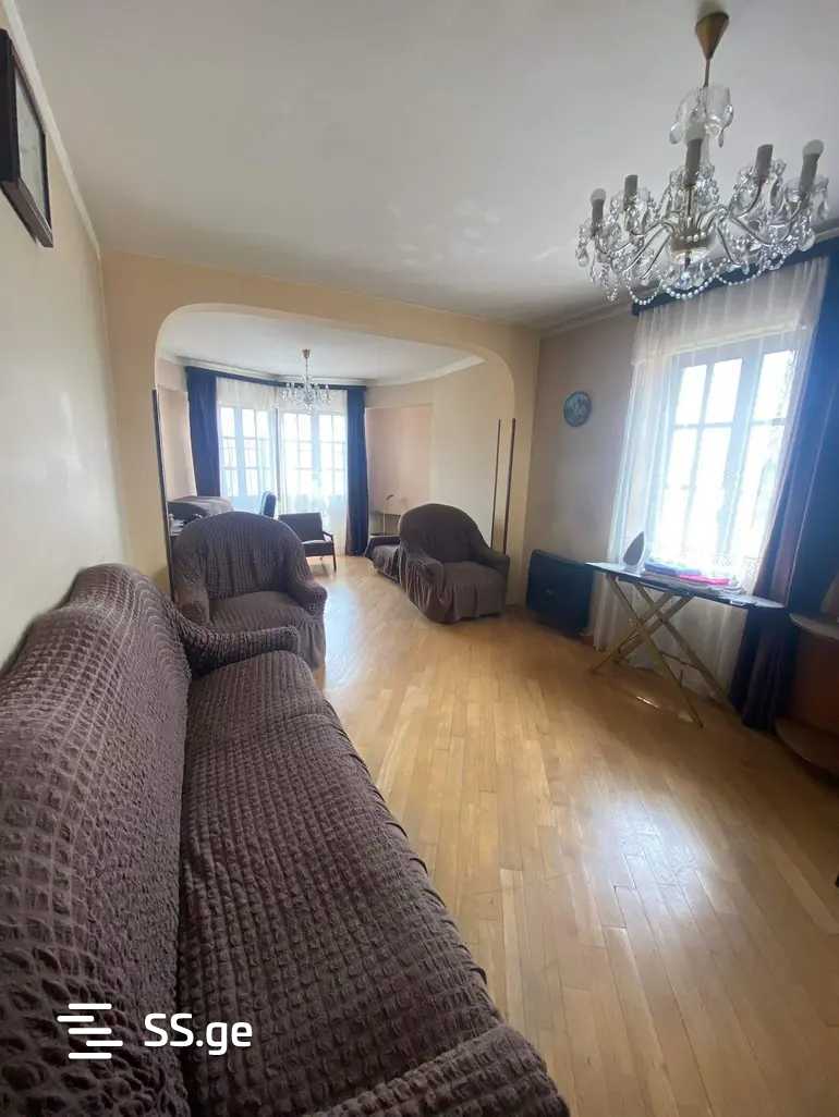 Apartment for rent with furniture and appliances, 94 sq/m, old renovation, on the side of Khizanishvili Street, on the top floor of a 16-story building.