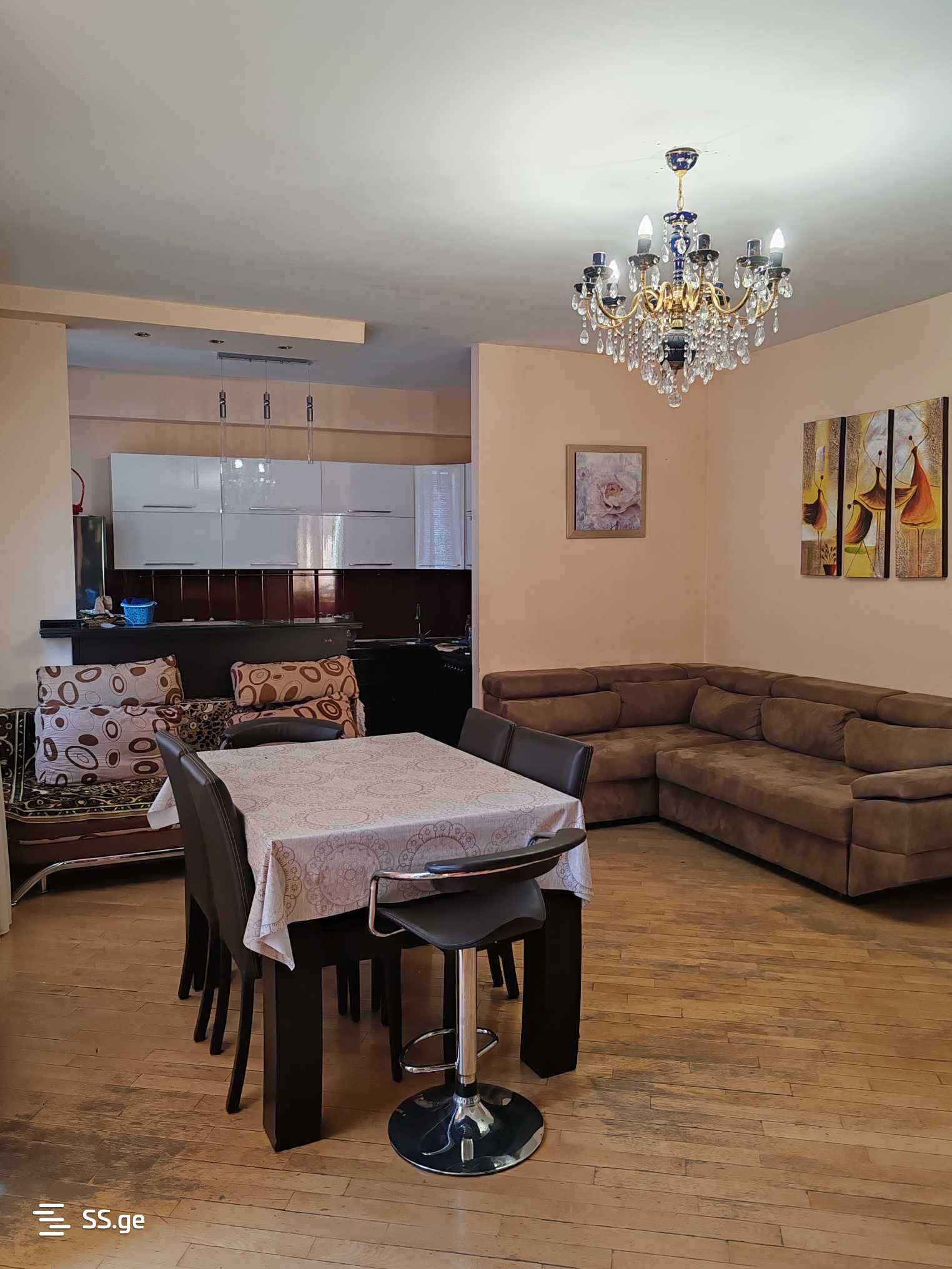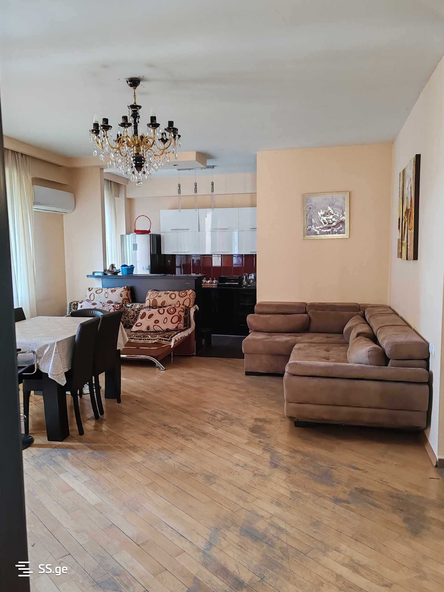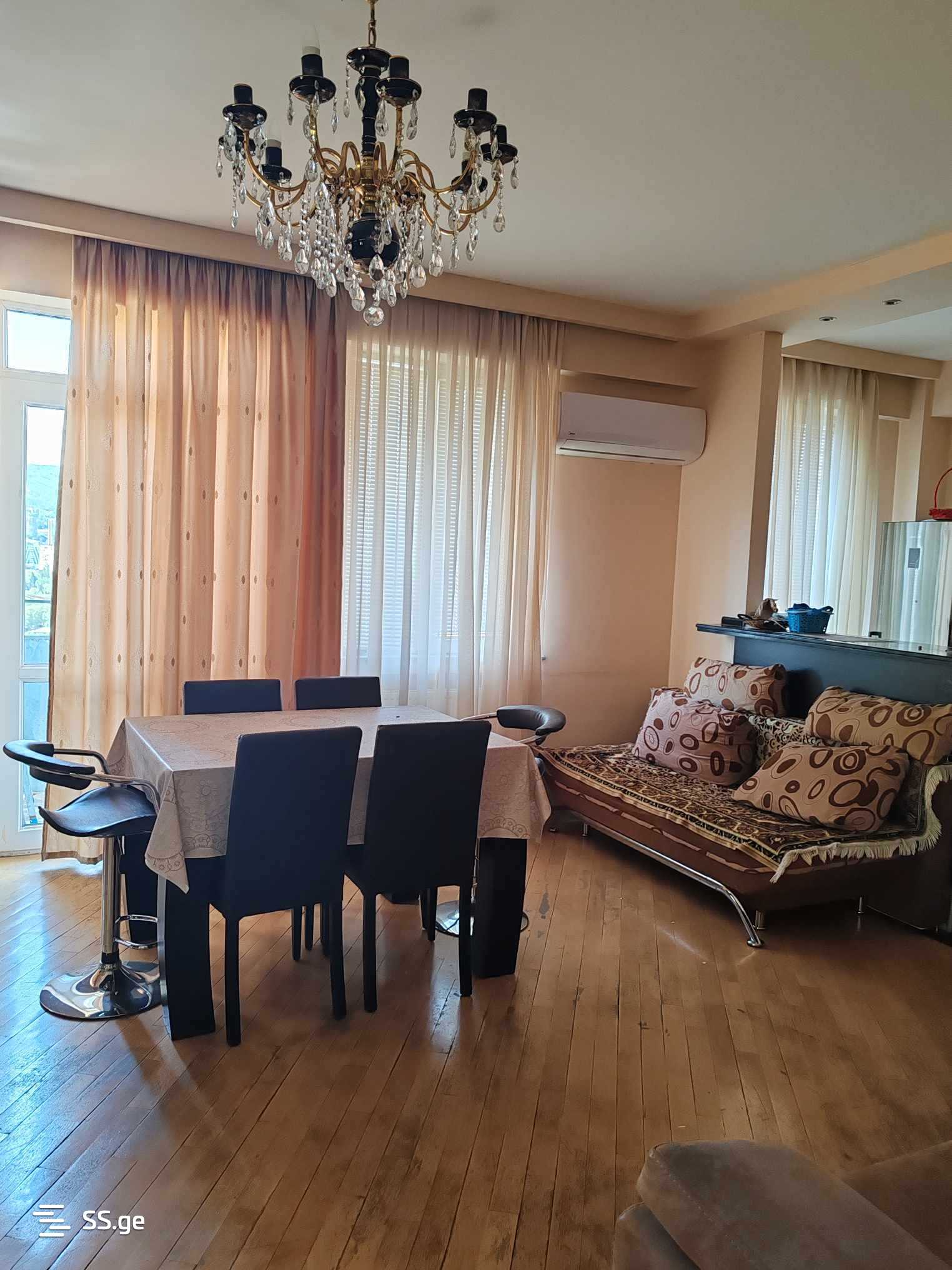 For rent: 3-room apartment, 76 sq. m., 10(15), near Cinema Georgia, by Didube Metro, in a newly built building, non-standard layout, bright apartment, with 2 balconies, renovated, central heating, iron door, hot water, air conditioning, refrigerator, washing machine, television, internet, WIFI, intercom, furnished, with a wardrobe, bed, convertible sofa, kitchen inventory, with a view of the city.