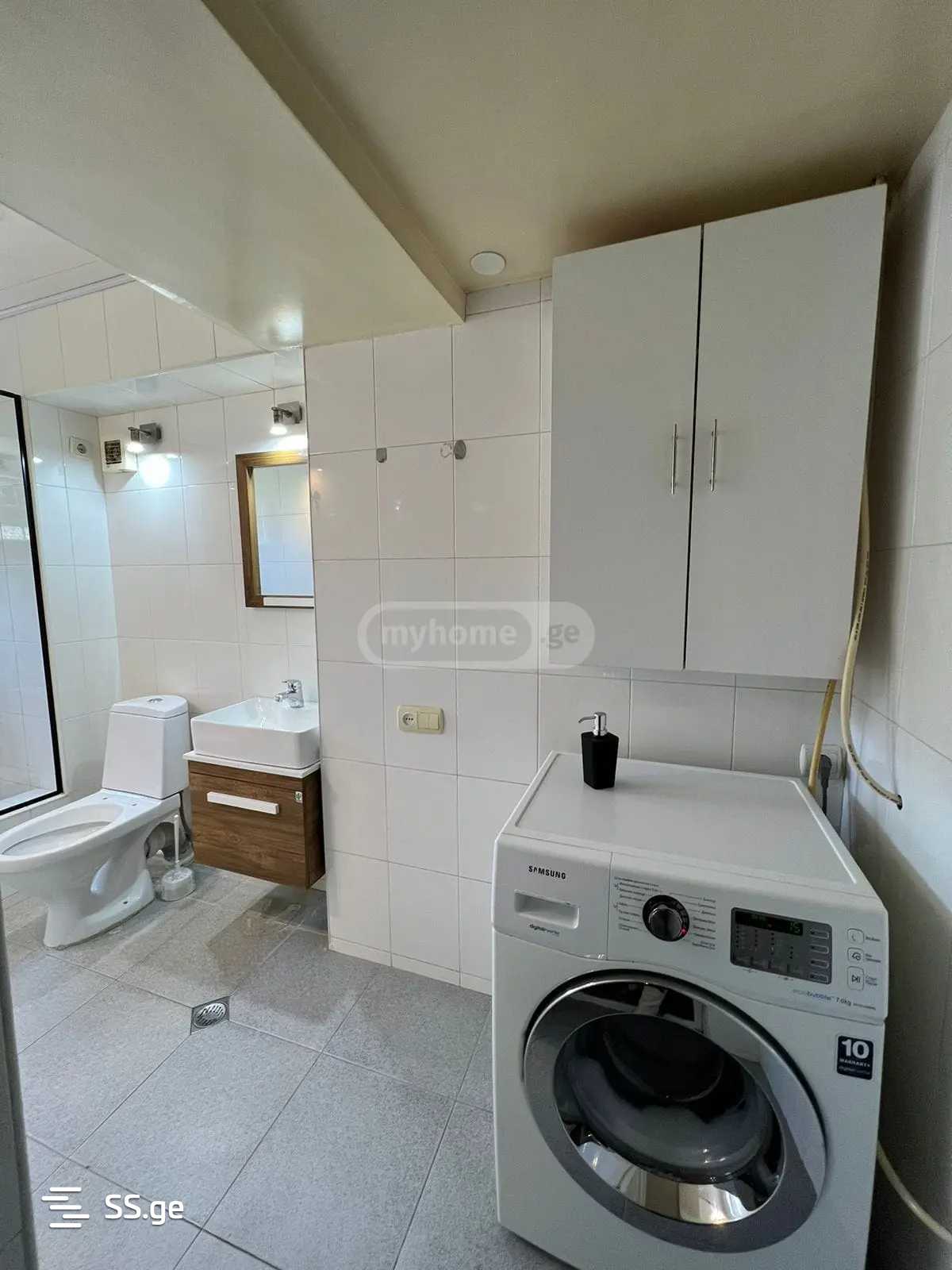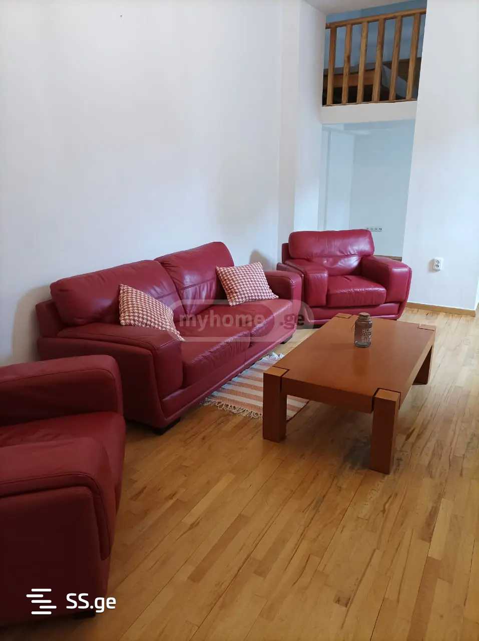For sale is a 105 sq.m. apartment with a mezzanine on Tsintsadze Street. It has 1 small bedroom + 1 small home office, the isolated bedroom is 24 m2, living room, separate kitchen, and 1 bathroom, the appliances are of very high quality, including a dishwasher, it is a very secure and cozy apartment, the ceiling is up to five meters, and the fireplace is functional.