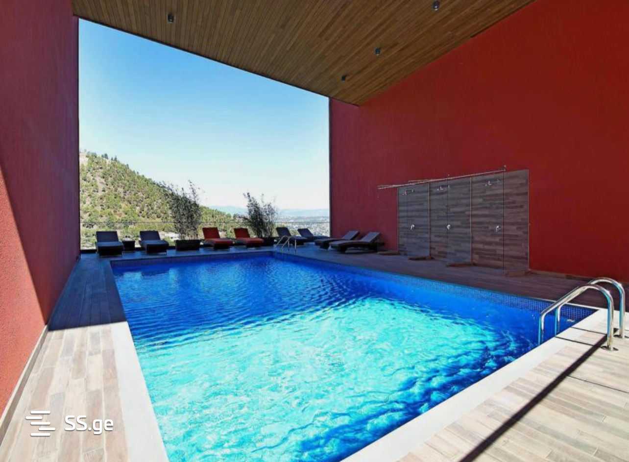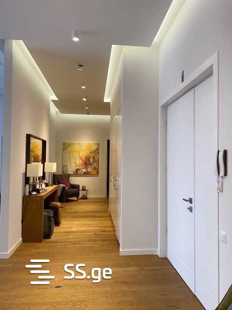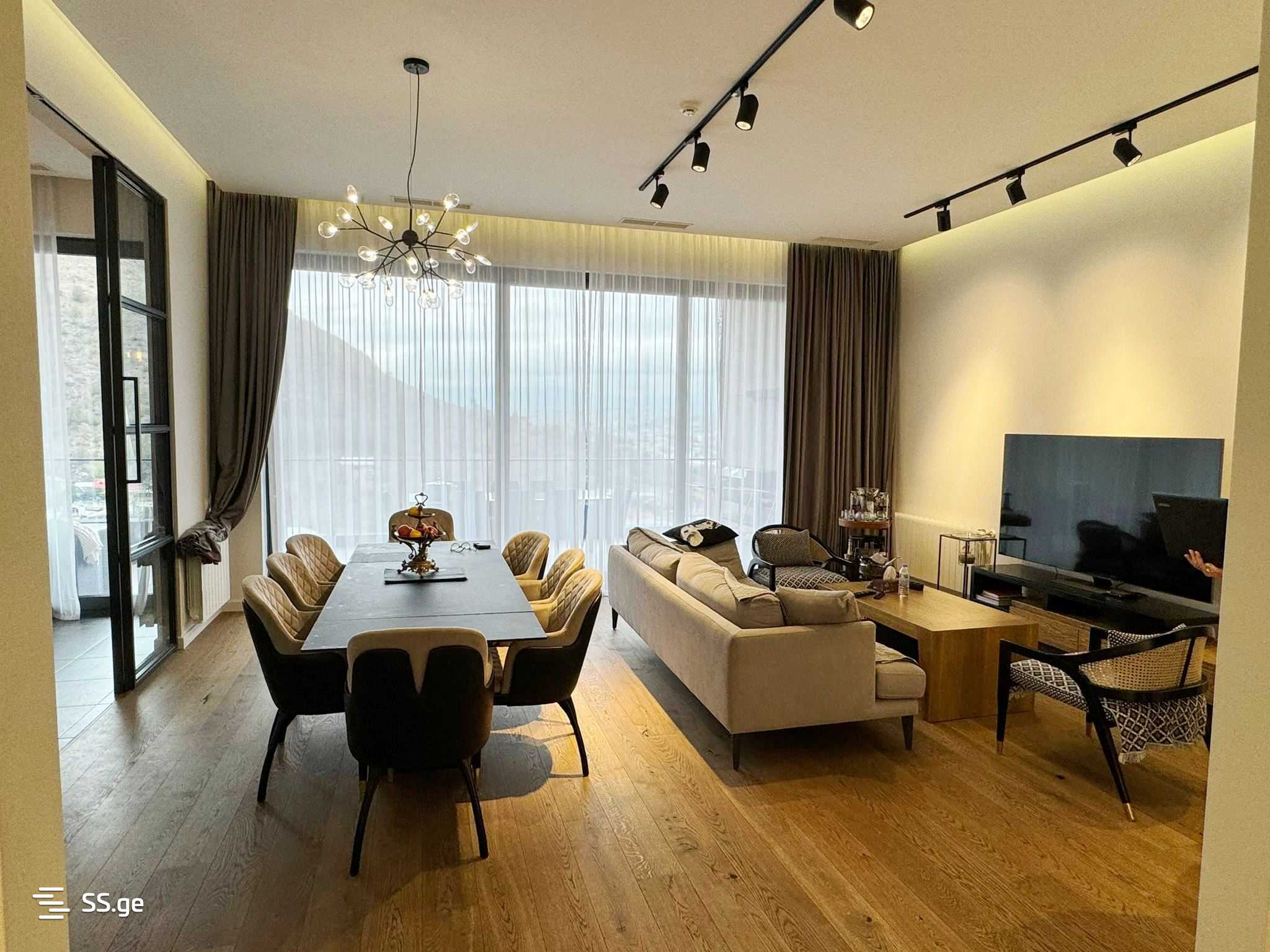 4-room apartment for rent on Makashvili Street in Skyline Residence built by M2, 205 sq m, 2(4) floors, 30 sq m veranda, 3 bedrooms, 3 bathrooms, master bedroom, furniture and appliances, parking, 24-hour security, panoramic views. Equipped with an outdoor swimming pool and a gym 95115