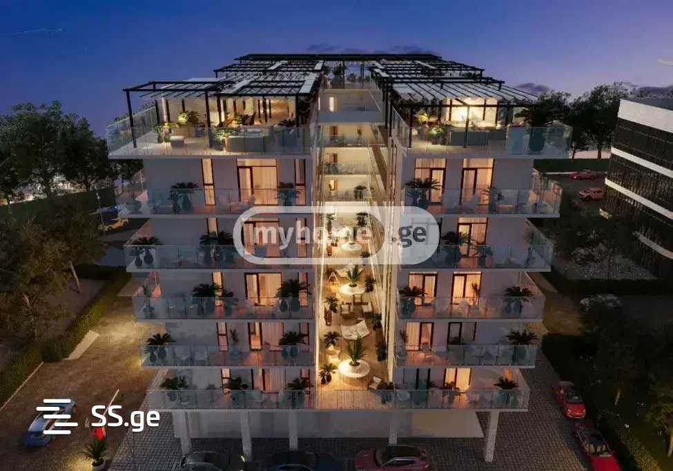 For sale, an apartment in a construction complex on Ruruas Street in Batumi, in white frame condition with a large veranda. The project is scheduled for completion in 2026 and internal interest-free installment payment is possible with a preliminary deposit.