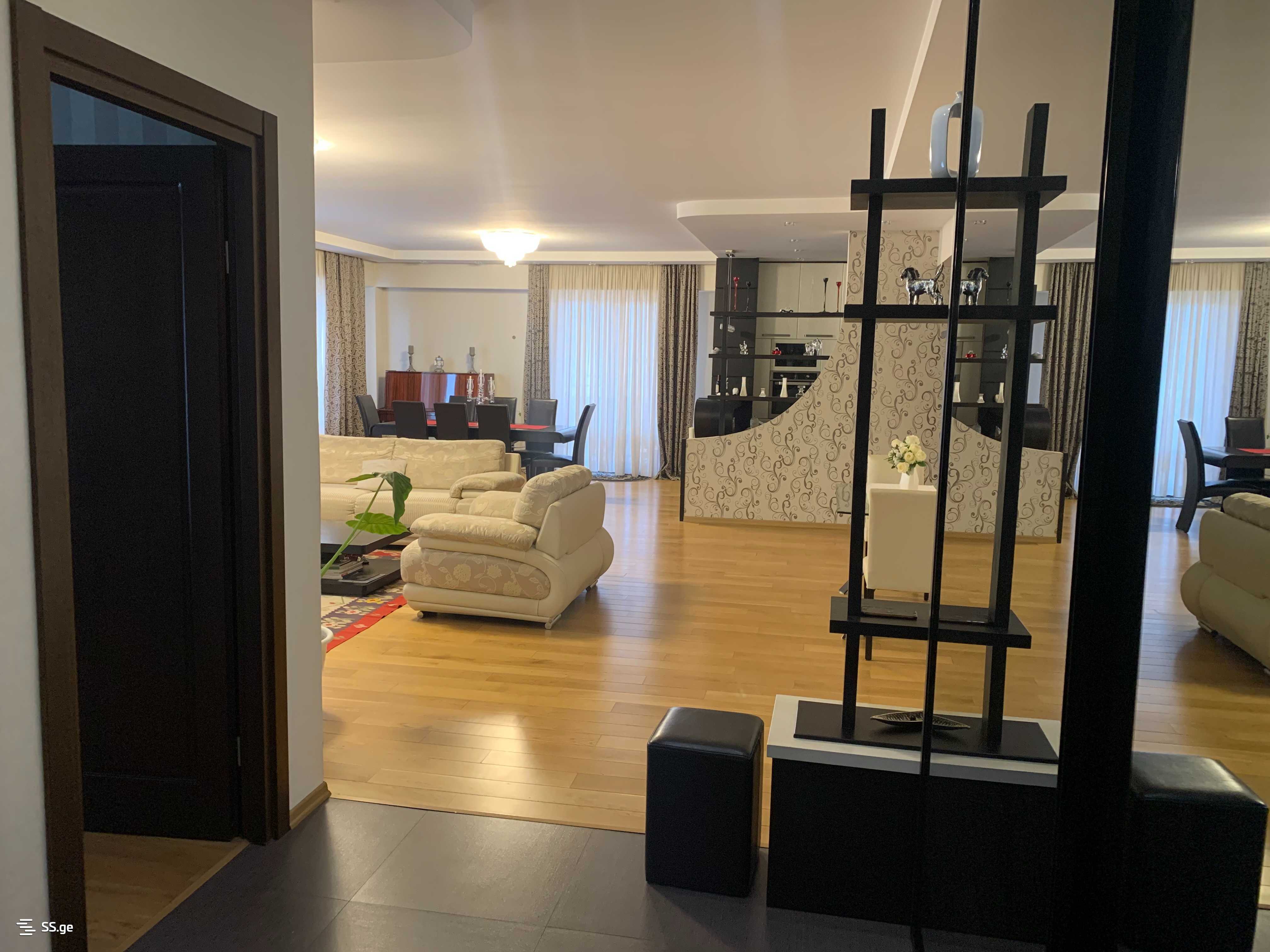 Apartment for sale, 300 sq.m. in the center of Saburtalo. View towards Pekini and Shartava Streets, as well as a 180-degree view of the city from a 142 sq.m. veranda. The apartment has 2 bedrooms (19-20 sq.m.), an office (14 sq.m.), a hotel room, and an entrance hall (67 sq.m.). Semi-studio kitchen is 18 sq.m. There are 2 bathrooms. 18 sq.m. of auxiliary space, which includes a laundry area, auxiliary kitchen, and a storeroom. Doors and windows from the Dio company. Steel entrance door made in Israel. Bathrooms are equipped with Villeroy & Boch and Roca fixtures, San Grotess faucets. The kitchen and the entrance door are MDF and equipped with Teka appliances.