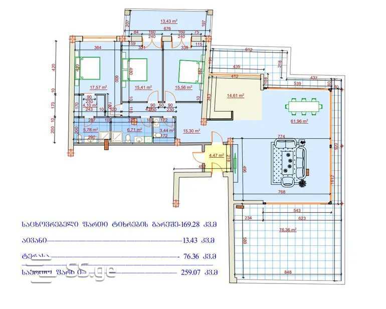 4-room penthouse 249 sq m. Vake, Ramishvili 33, floor 11 (green frame) three bedrooms (one bedroom has its own bathroom and dressing room). Common room, three bathrooms, kitchen, veranda. Well-equipped entrance hall and yard. Has a garage