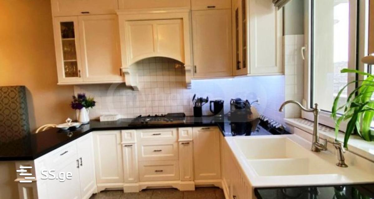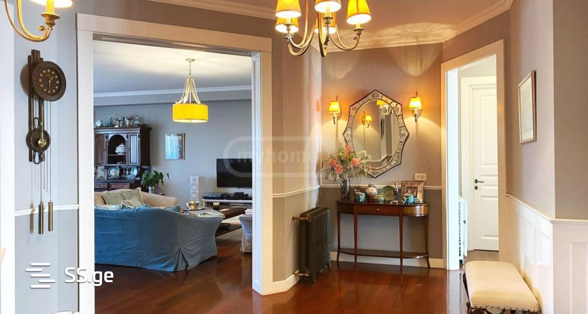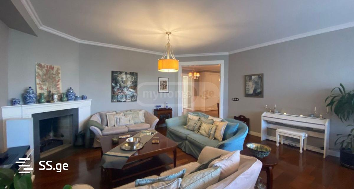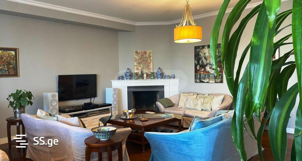 The apartment is located in a newly built residential house in Vake, Ilia Chavchavadze 5. The residence is in high demand by international companies and diplomats due to its location, services, security, proper infrastructure and expansive views. The residence is served by a 24/7 concierge, security, cleaning, maintenance, elevator service. The lobby has 2 elevators that also run on a generator if needed. The hall is newly renovated, the apartment is on the twelfth floor, the total area is 180 sq.m. A large room opens from the large hall, where a dining area and a sitting-TV area with a fireplace are separated. The kitchen has a separate entrance from the hall, however, it also has access to the dining area through a sliding door built into the wall, the apartment has three bedrooms, one "master bedroom" has its own bathroom with a walk-in bath, and the second bedroom has a shower in the bathroom. In one of them there is a study, three bathrooms.