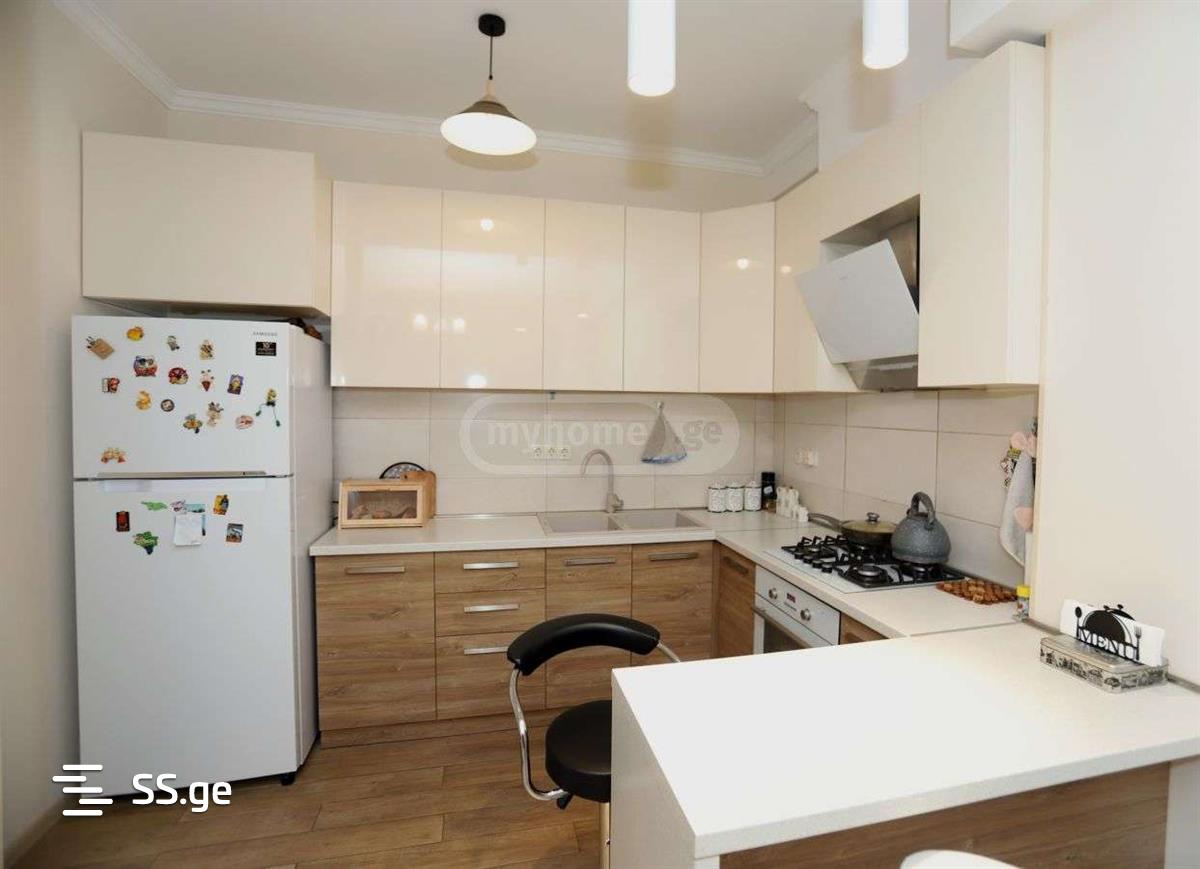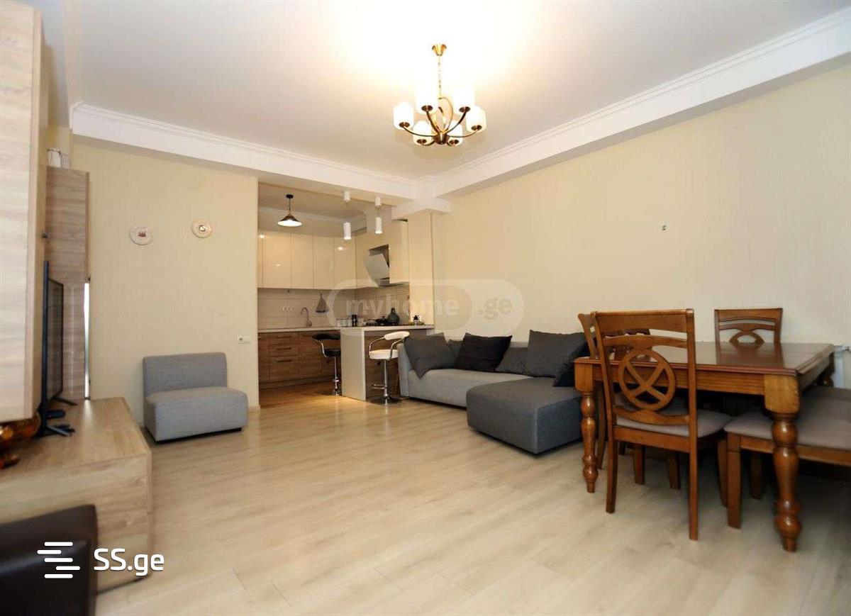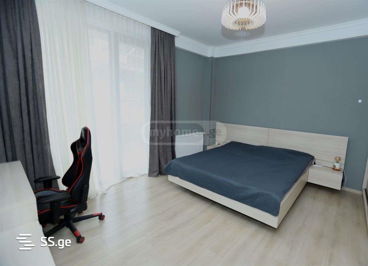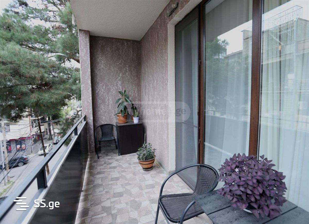A 120 sq.m. 4-room apartment is for sale in a newly built building on Tabidze Street, with a studio-type living room, three bedrooms, two bathrooms, a balcony, and furniture. The exit from all the rooms is on the balcony. The entrance is equipped with cameras