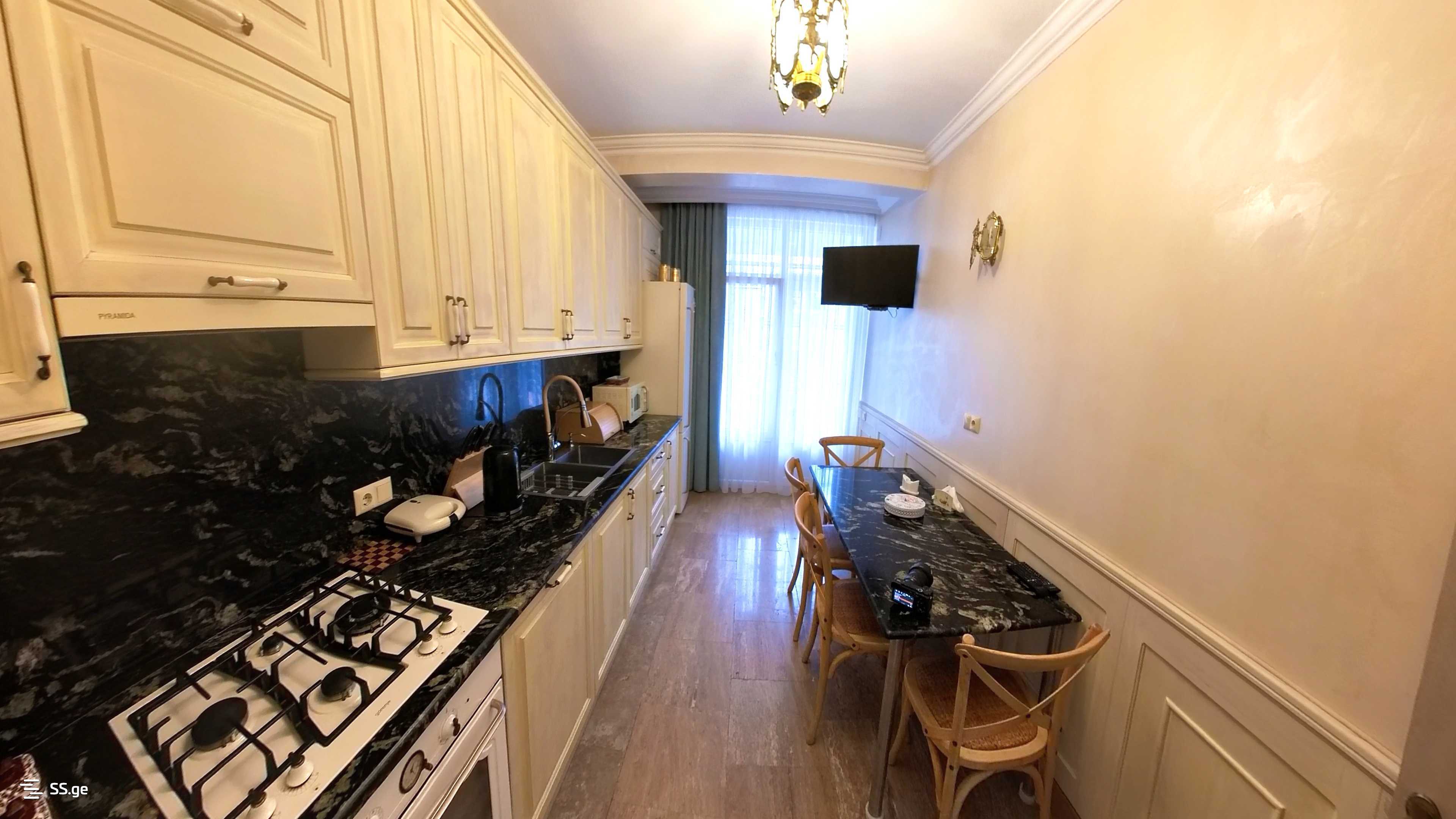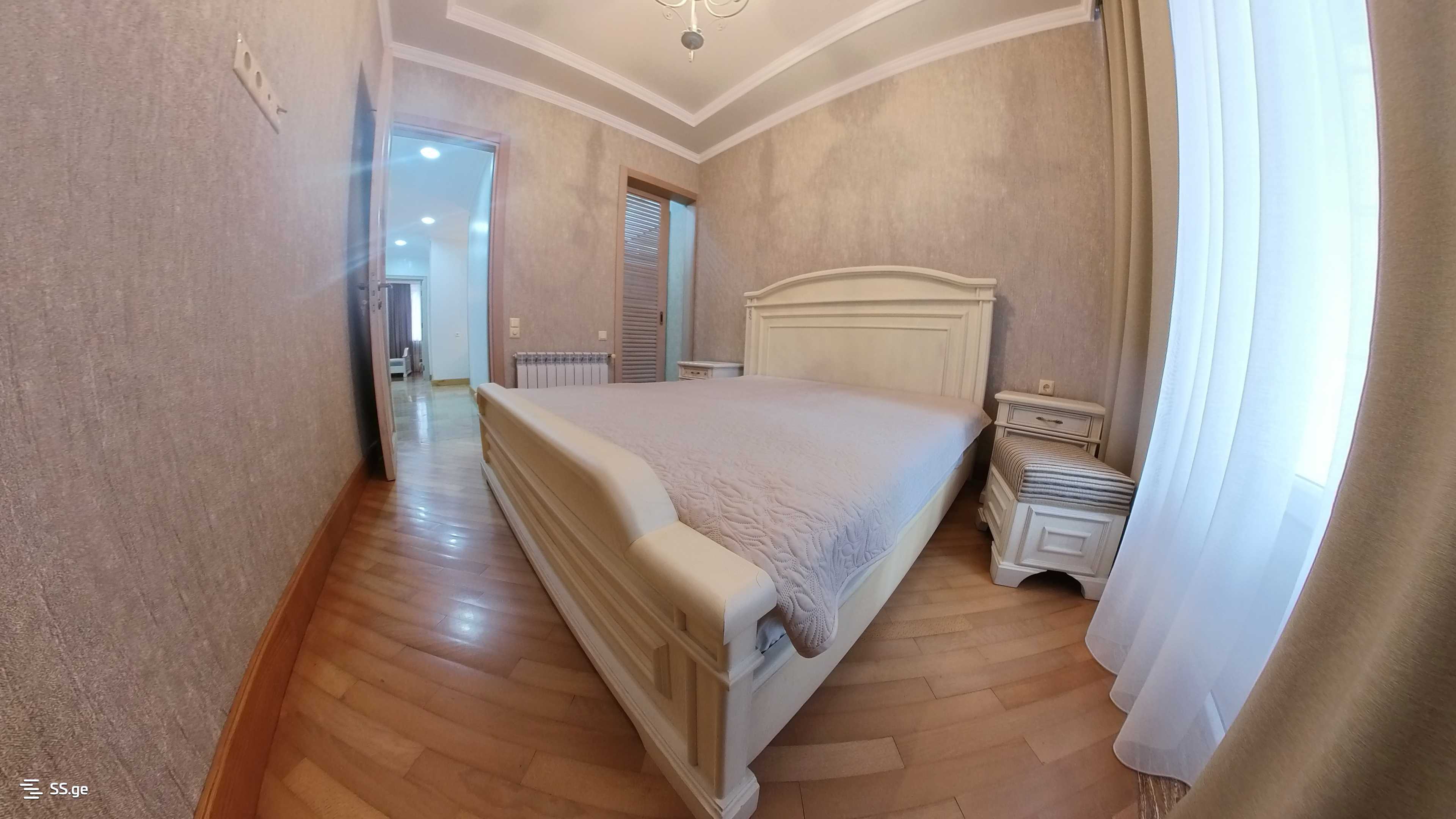 For rent in the central part of the city, an apartment. 3 bedrooms, a dressing room, an office, a separate kitchen, a living room, 2 bathrooms, a cross apartment with balconies on both sides. All rooms have primary lighting. It is renovated with the highest quality natural materials. The furniture is made of natural wood.