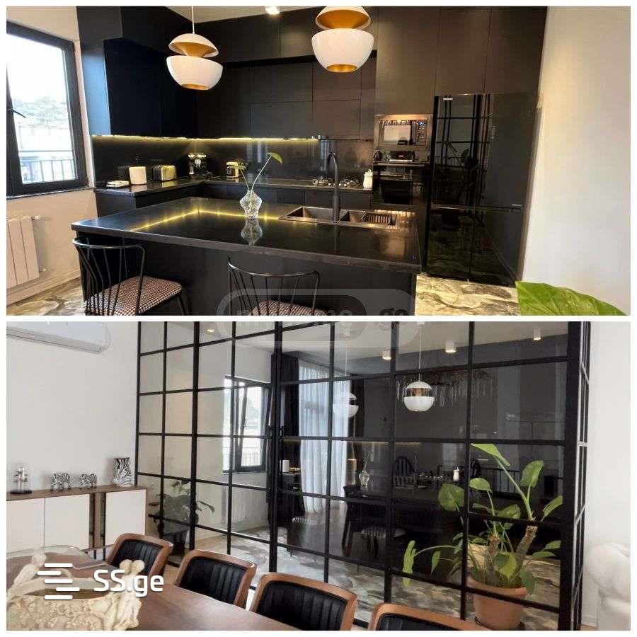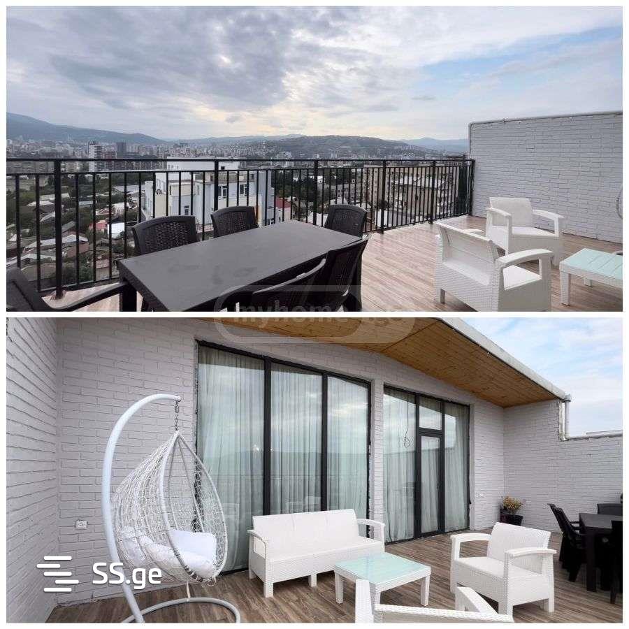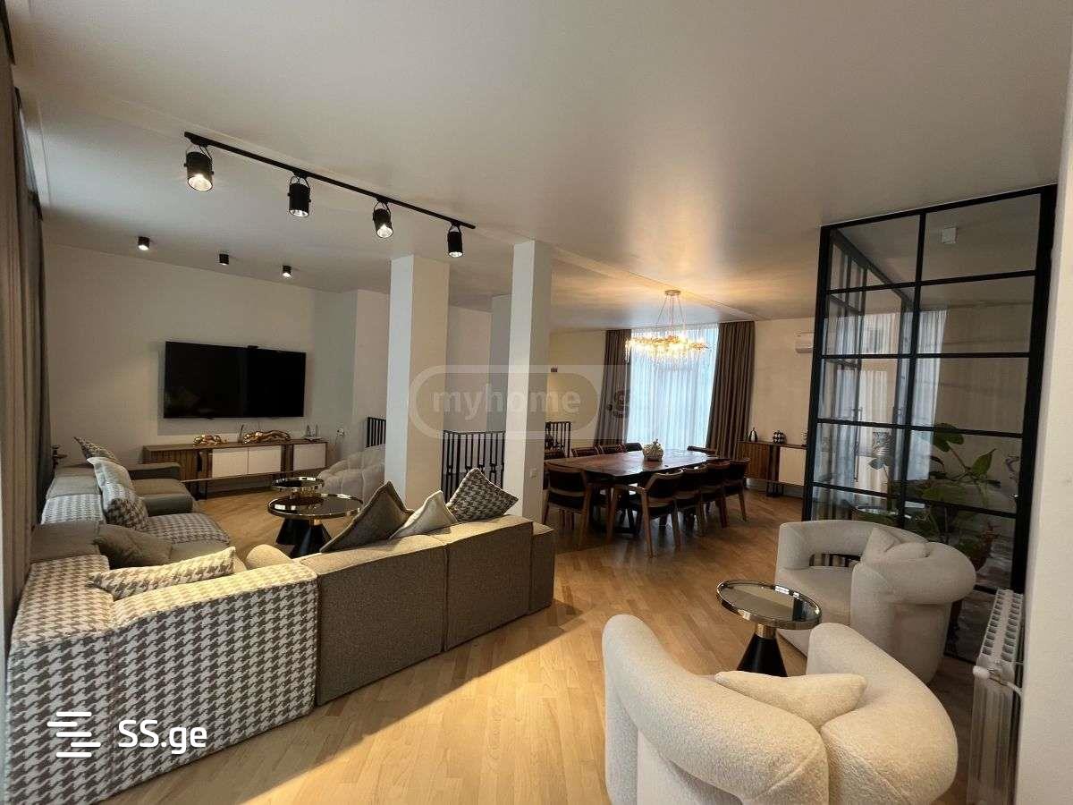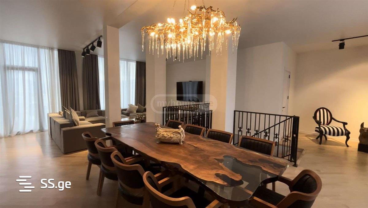 6-room duplex for sale, 5 minutes walk from Nadzaladevi metro station. The apartment is located in a business class, newly built prestigious building. Most of the furniture has been ordered from abroad. A $12,000 walnut table, a $50,000 kitchen, top-quality lighting, heat and sound insulation, sandwich panel roofing, and so on are all things that make this apartment special.